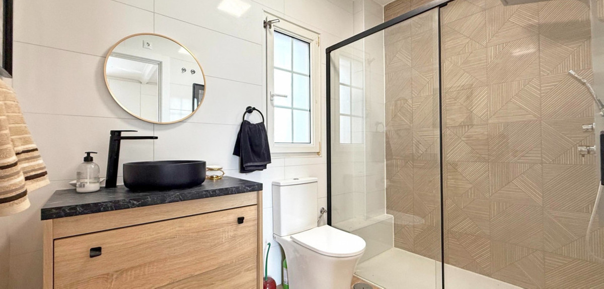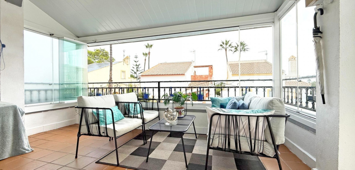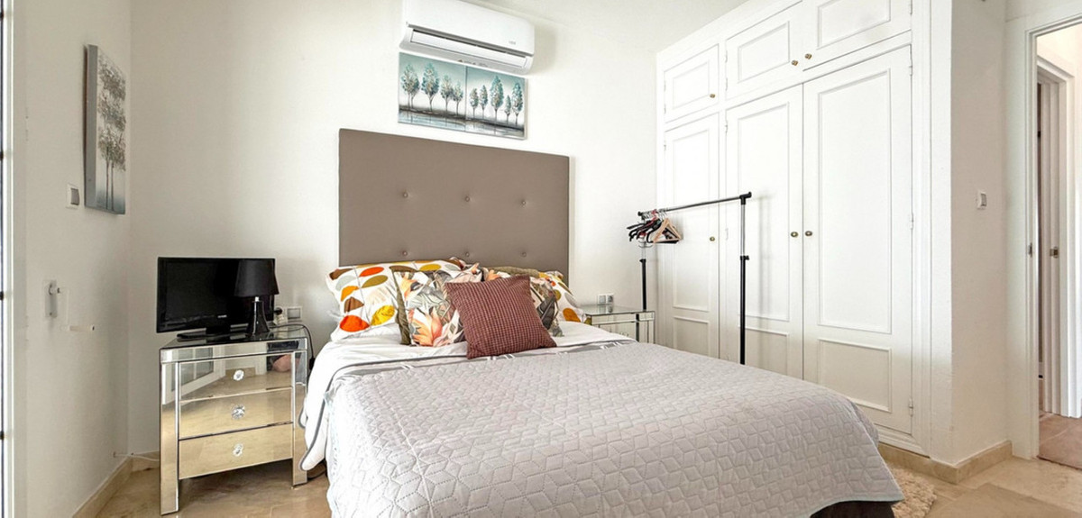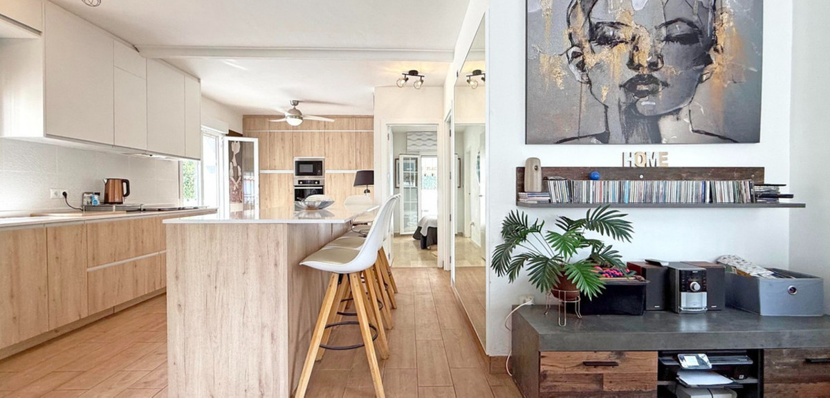 The guest bedroom opens onto a private patio, also fitted with glass curtains, while the master bedroom boasts a generous solarium with stunning sea views. Additional highlights include air conditioning throughout, optional central heating, two large storage rooms, and an excellent location in a quiet and private area of Villamartin. All this just a short walk from the famous Villamartin Plaza and the golf course.