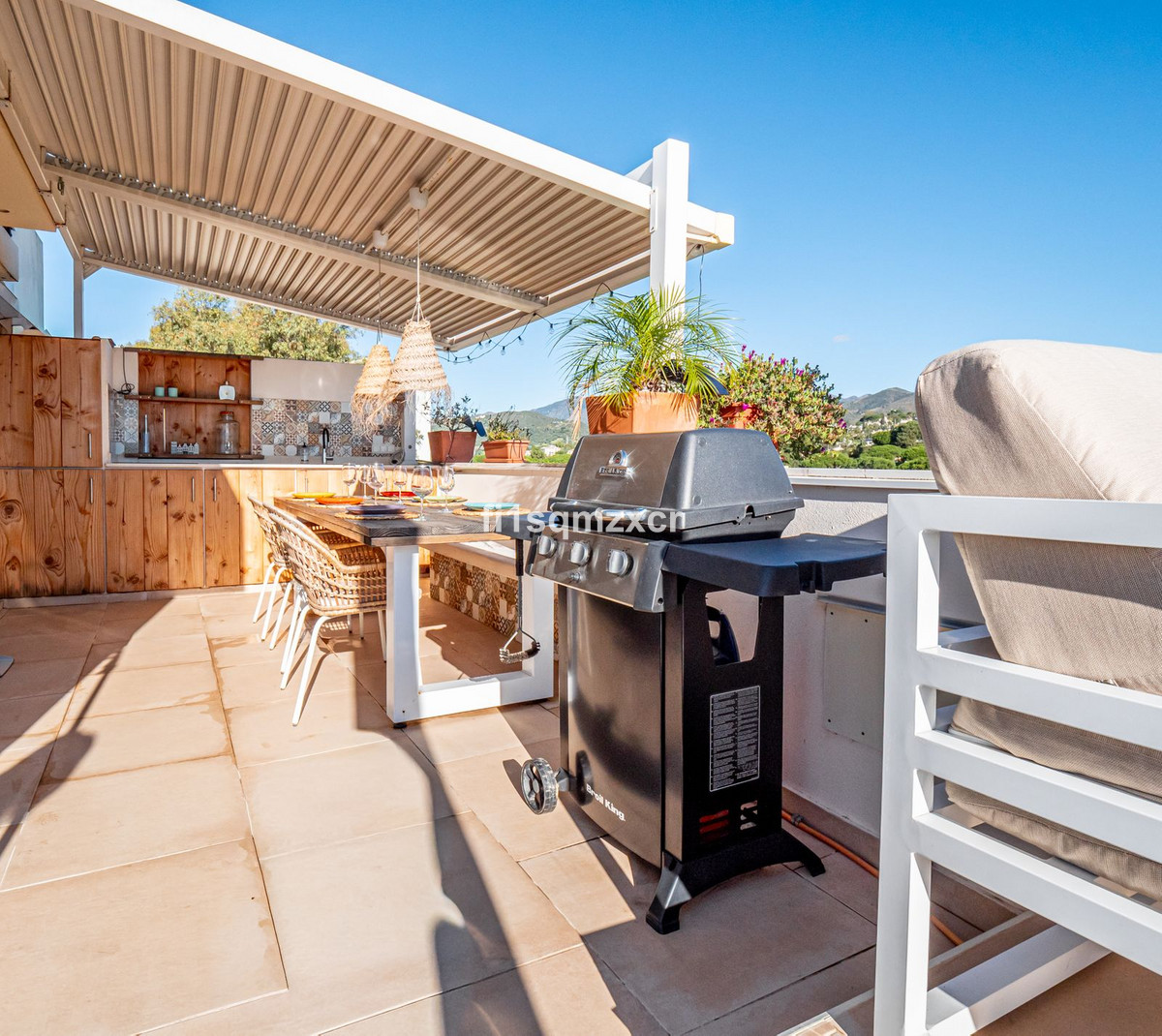 This unique corner penthouse with extraordinary views is located just a few minutes' walk from one of Marbella's most beautiful beaches, home to the best beach clubs, chiringuitos, and beach restaurants. The property has been completely redesigned and modernized with the finest materials. From the entire property, you have spectacular views of the entire coastline, Africa, and the mountains. Fourth floor: Hallway/entrance with stairs to the upper floor, guest toilet, new modern kitchen with a bar and high-quality appliances, a TV corner with a wood-burning stove for romantic evenings, a large L-shaped dining area with panoramic views, a bedroom, and a spacious bathroom.