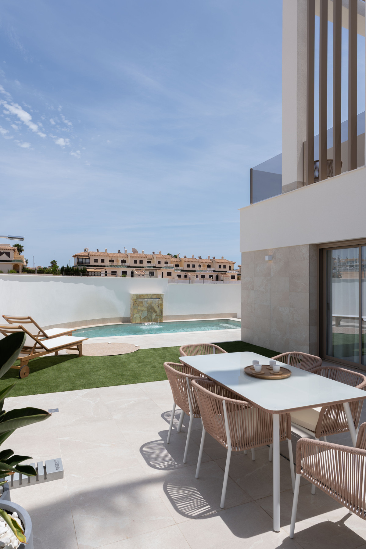 Boligerne har tre soveværelser, to badeværelser og to ekstra gæstetoiletter, hvoraf det ene er udendørs ved siden af den private swimmingpool. Hver ejendom inkluderer også en privat grund og parkeringsplads på stedet.