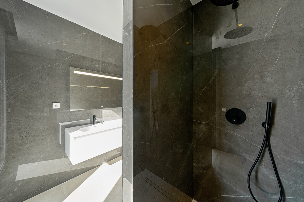 The first floor is dedicated to the main sleeping quarters, including a spacious master bedroom with en-suite bathroom and private terrace, along with additional guest bedrooms designed for comfort and privacy. Above, a generous rooftop solarium provides a versatile outdoor space ideal for sunbathing, entertaining or creating a chill-out lounge with open views of the surrounding residential area.