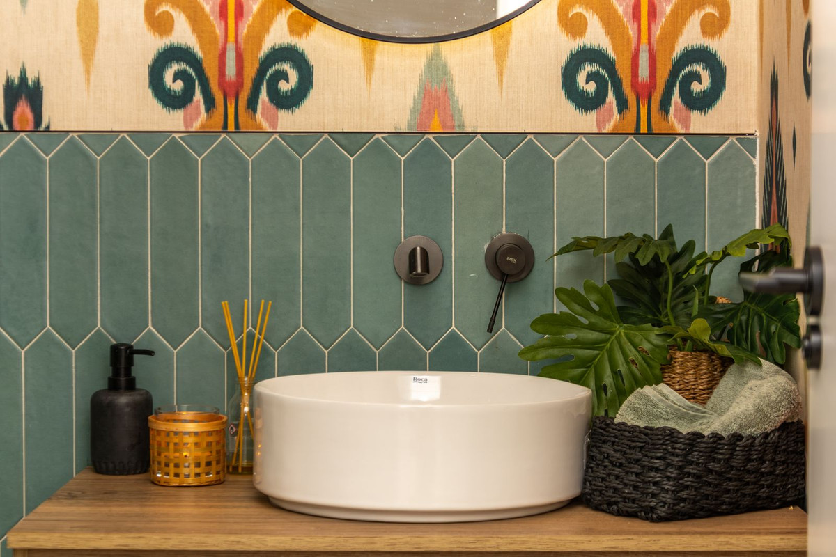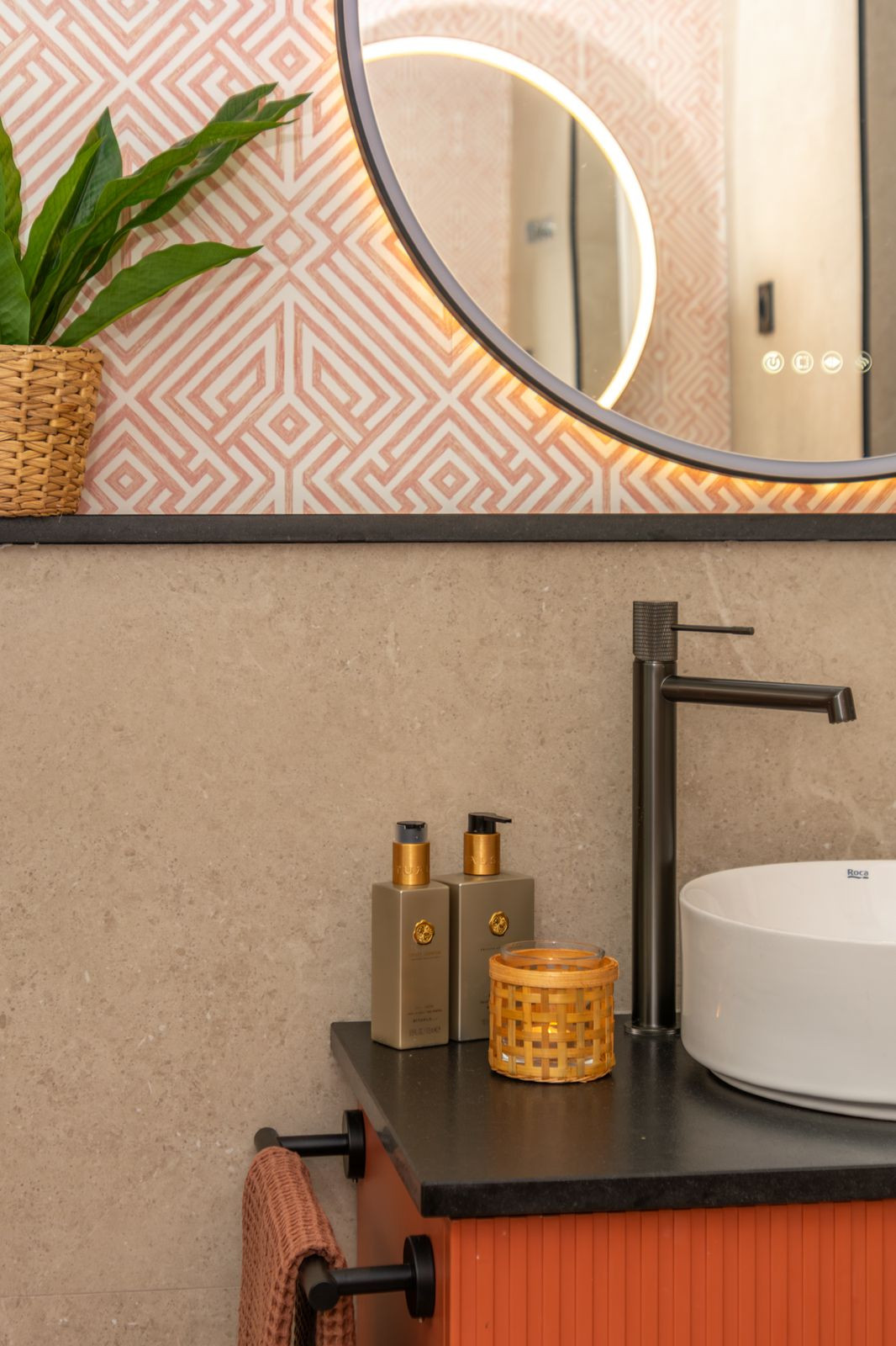Badeværelse: Stilfuldt badeværelse med bruseniche, håndvask, toilet og opbevaring.