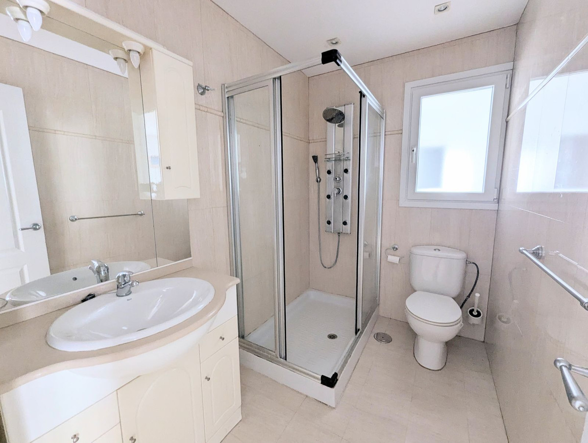 The home is distributed over two levels and offers three spacious bedrooms and two bathrooms. Two of the upstairs bedrooms open onto a private terrace with lovely views over the communal gardens, swimming pool, and even a glimpse of the Mediterranean Sea.