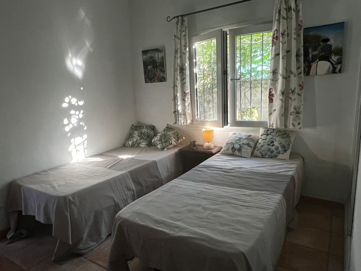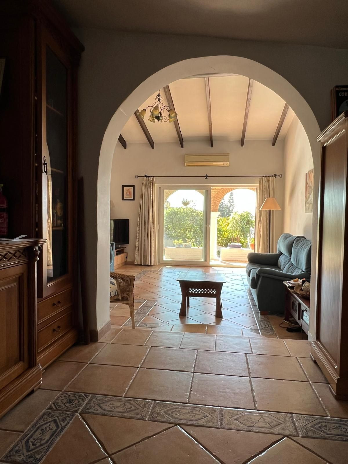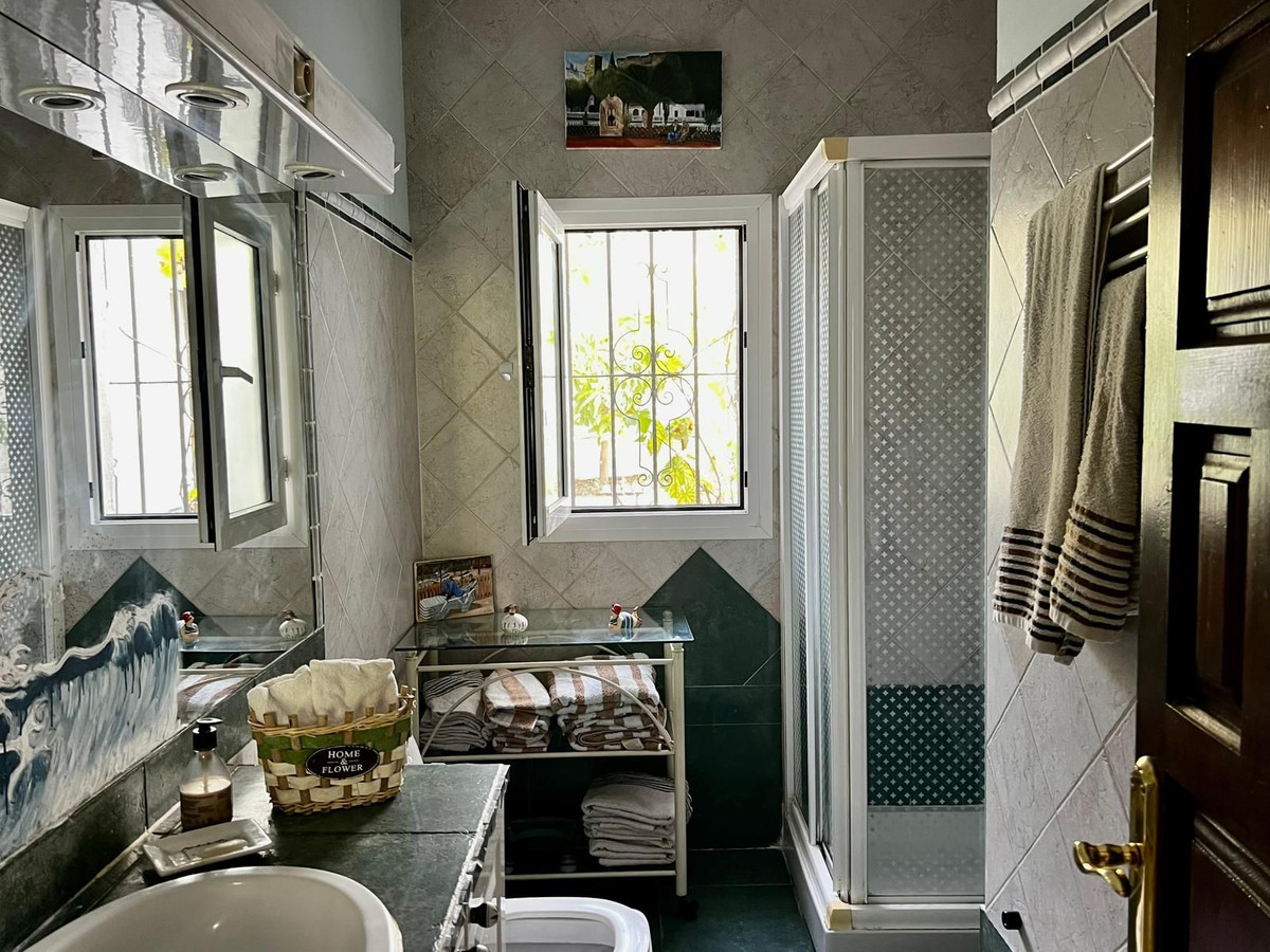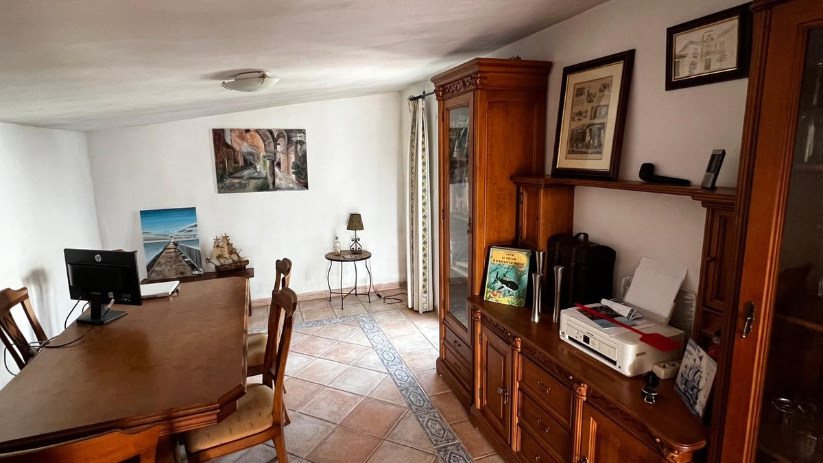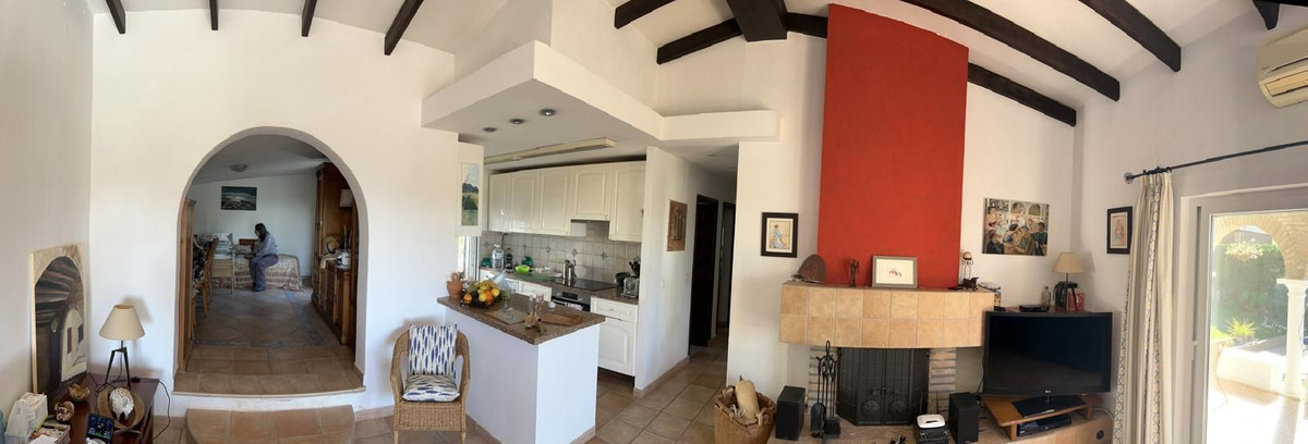 Indendørs byder huset på et hyggeligt åbent køkken, der forbinder til en rummelig stue og spisestue. En brændeovn, synlige træbjælker og buer i andalusisk stil giver rummet varme og personlighed. Boligen er desuden udstyret med aircondition, hvilket sikrer komfort hele året rundt.