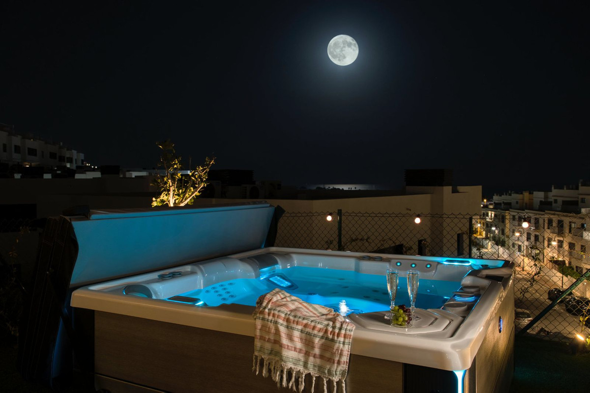 The entry level features a bright, open-plan living room and a modern kitchen. Expansive glass doors blur the line between indoors and out, leading you to your private garden with a hot tub — perfect for relaxation and entertaining all year long. Upstairs, the master suite offers its own bathroom and balcony, accompanied by two additional bedrooms sharing a second bathroom. From here, a comfortable staircase takes you up to