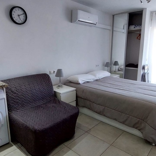 The apartment offers 25 m2 of well-utilized living space, including a terrace, one bathroom, built-in wardrobes, a sofa bed, and a wardrobe with bunk beds, allowing for optimal use of space and comfortable accommodation for several people.