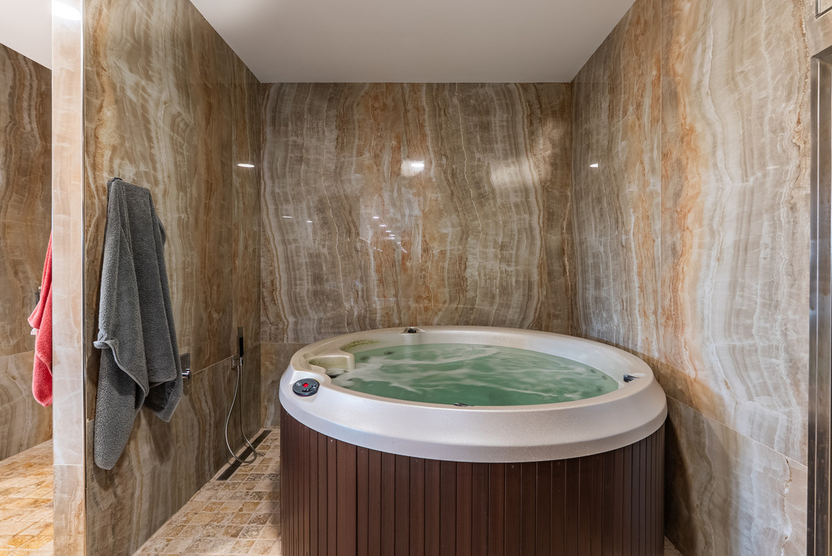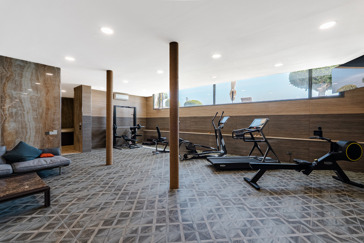 A dedicated lower level is designed as a private wellness retreat, offering a complete lifestyle experience within the home. This level includes a spa area with sauna, steam room, and jacuzzi, as well as a fully equipped gym with natural light.
