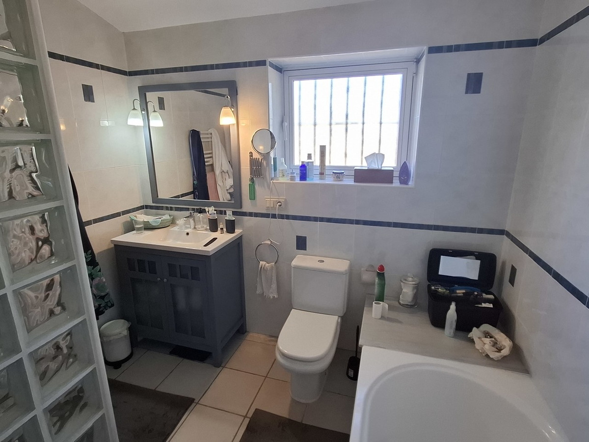 Continuing through the home, you reach the primary bedroom—a generous double room with fitted wardrobes and glass doors opening onto the rear terrace. This serene space also includes a private en-suite bathroom, complete with bathtub and separate shower.