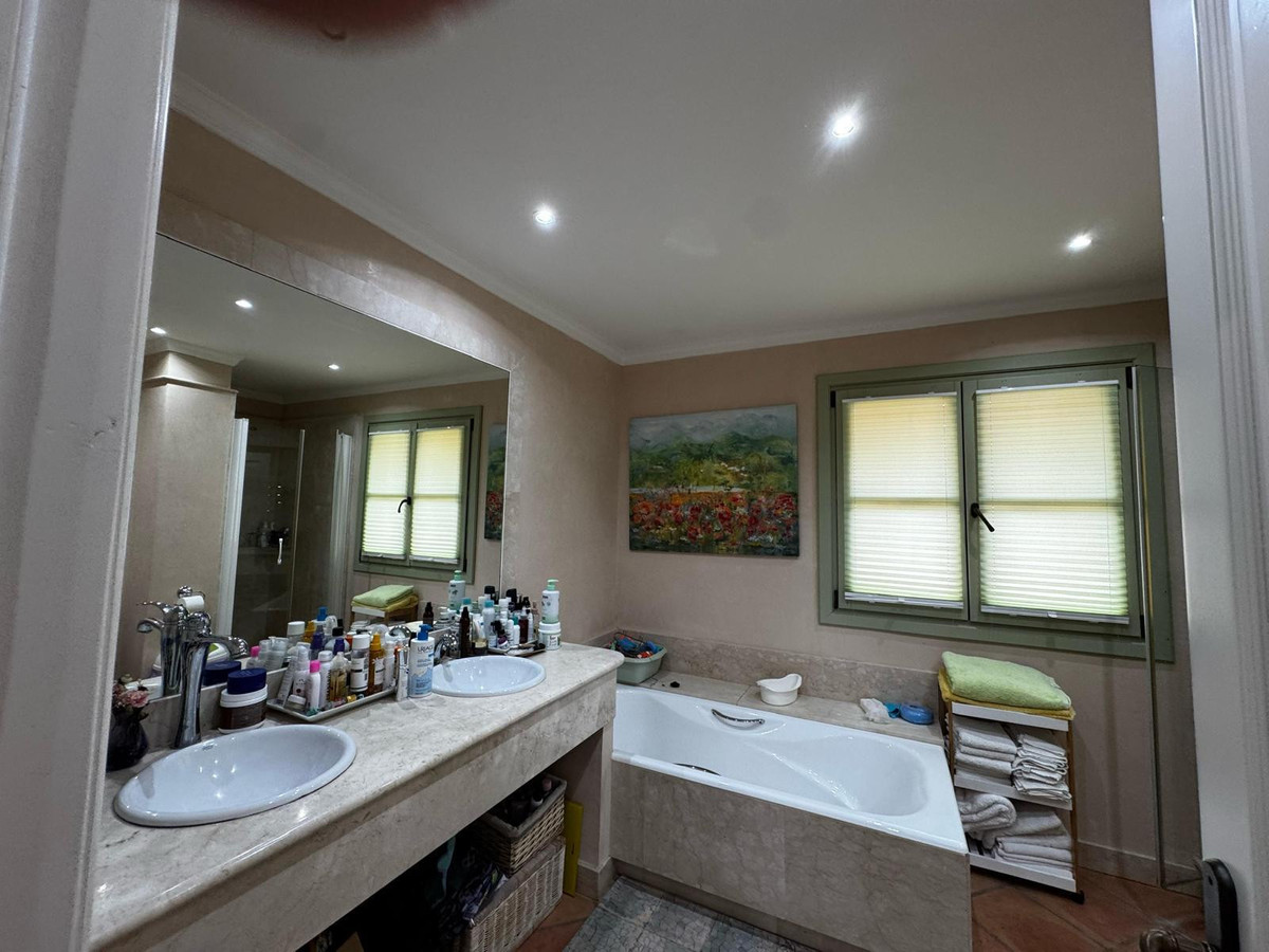 The residence is thoughtfully arranged over several levels, providing four spacious bedrooms and four bathrooms, two of which are en-suite, along with an additional guest toilet. The interior is beautifully appointed, featuring air conditioning, underfloor heating throughout, and gas heating to ensure year-round comfort. Marble floors add an elegant touch, while the fully fitted kitchen and included furnishings offer a move-in-ready experience. A charming fireplace in the main living area creates a warm and inviting atmosphere, ideal for relaxing or entertaining guests.