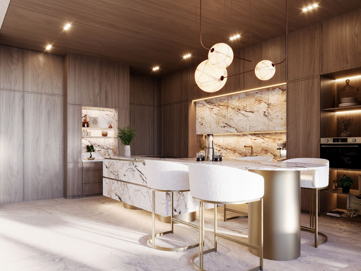 Expansive dining area, living room with large windows and fireplace, and a fully equipped modern kitchen with high-end appliances and direct access to a panoramic terrace.