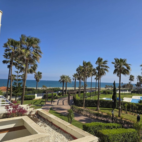 Cozy apartment with sea views comprising two bedrooms, two bathrooms, a living room with a kitchen, and a terrace with sea views.