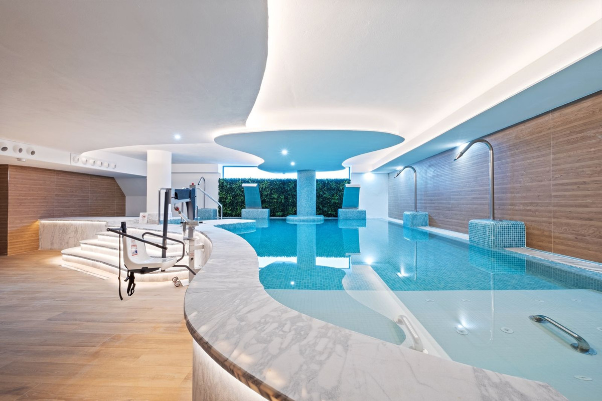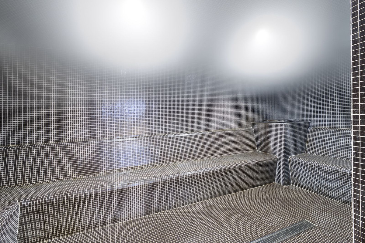 Residents benefit from excellent communal facilities, including an outdoor swimming pool, indoor pool, fully equipped gym, sauna, and a relaxing turquoise bath area.