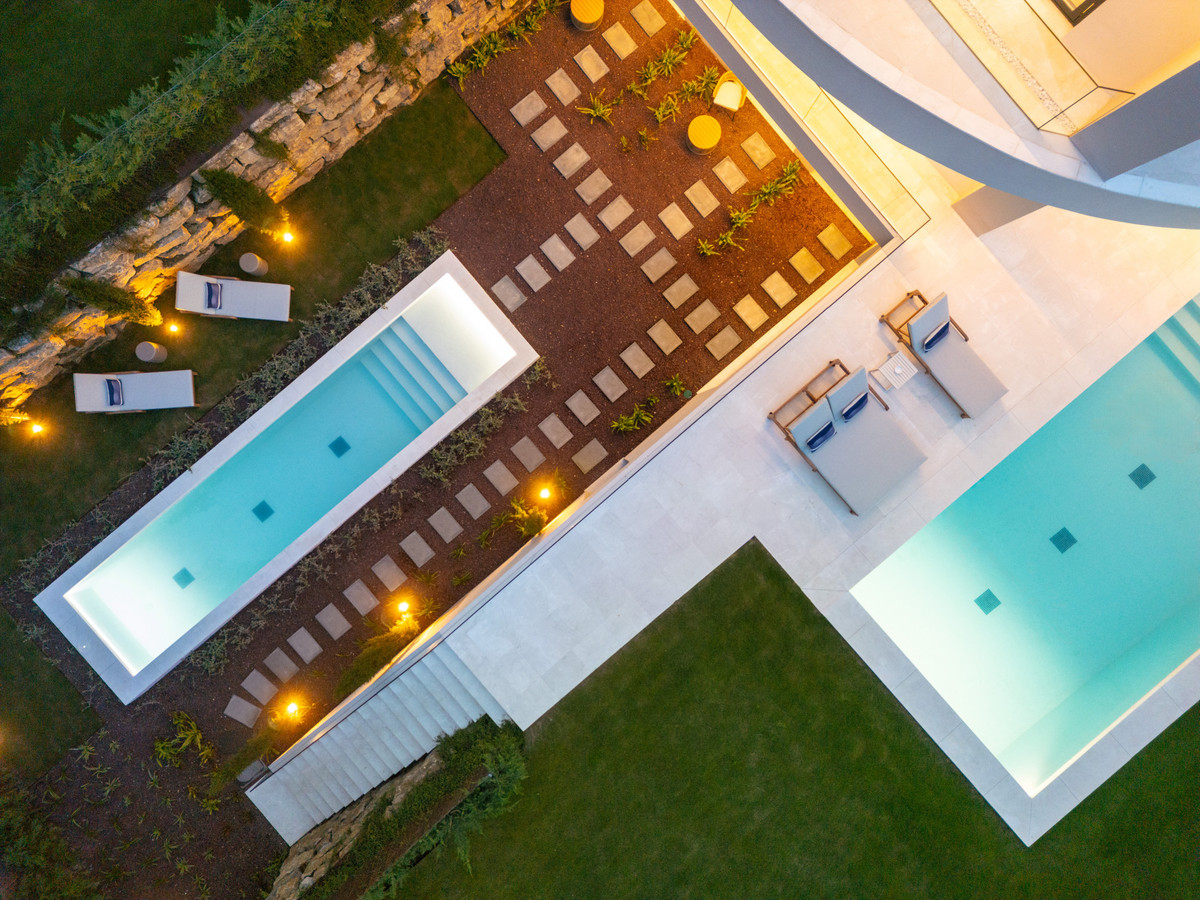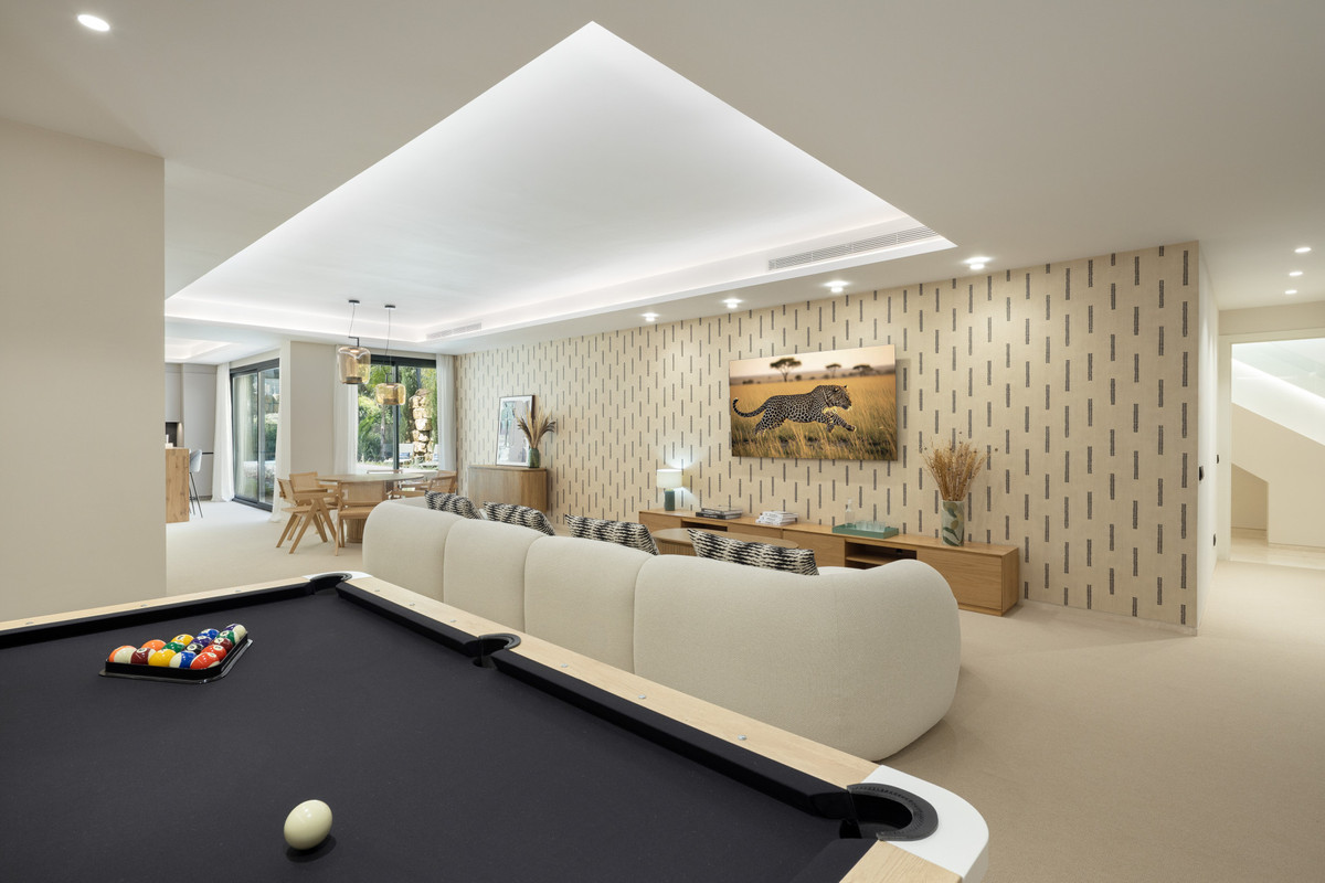 The lower level is designed for leisure and functionality, featuring a fully equipped gym, a bespoke bodega, a second living room, and an additional kitchen with bar area. This level also includes two en-suite guest bedrooms, both with direct access to a secondary pool area and landscaped gardens, creating a private retreat for guests. A three-car garage and guest toilet complete this floor.