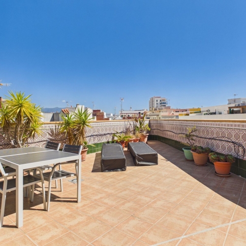 Exclusive corner penthouse in Dunas Green with a total of 175 m² of terraces. The main terrace faces southwest, enjoying morning sun thanks to the corner position and sun for most of the day, while the rooftop terrace gets sun all day. The property features 3 bedrooms, 2 bathrooms, and 1 guest toilet. Two covered parking spaces located next to each other. Well maintained and sold furnished. The community offers a beautiful pool, two padel courts, and spacious, well kept green areas, especially around the pool. Just a 15 minute walk to the sea.