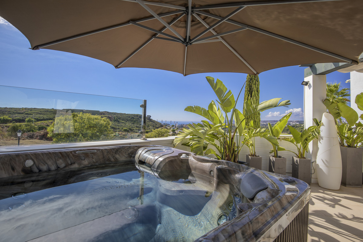 At the front, an enclosed outdoor living terrace with glass curtains serves as an elegant extension of the main living space—perfect for year-round enjoyment. Beyond, a further open terrace with a jacuzzi invites relaxation amid breathtaking panoramic views. At the rear, a peaceful garden terrace offers an intimate space to unwind. Additional features include air conditioning, ample wardrobe space, a dedicated office, private parking, a large storage room, and access to the resort's communal pool, gardens, and gym.