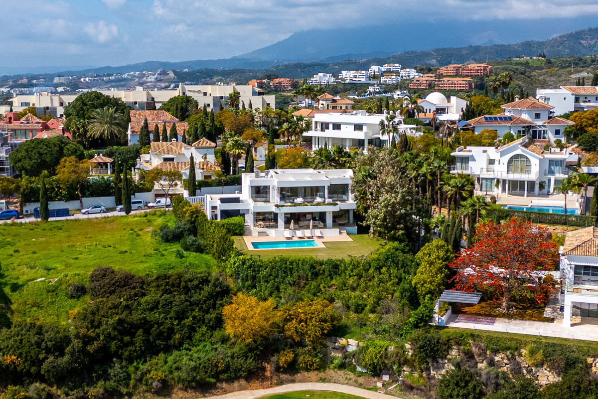 This is a luxury three level villa in Los Flamingos with panoramic golf and Mediterranean sea views. The property offers 4 en suite bedrooms, a private elevator, infinity pool, rooftop terrace, cinema room and gym. The villa comes fully furnished and is located in a secure and prestigious area, ideal for buyers seeking privacy, comfort and high end living near Marbella.