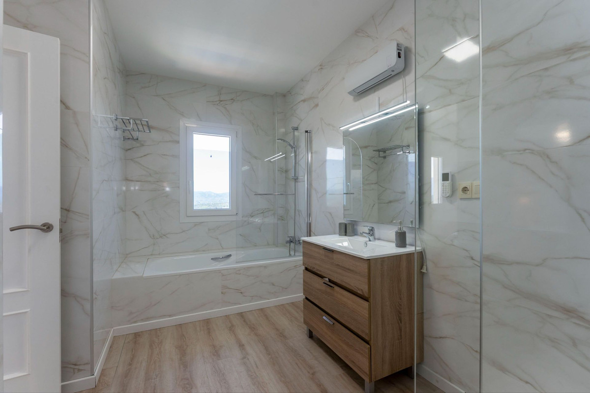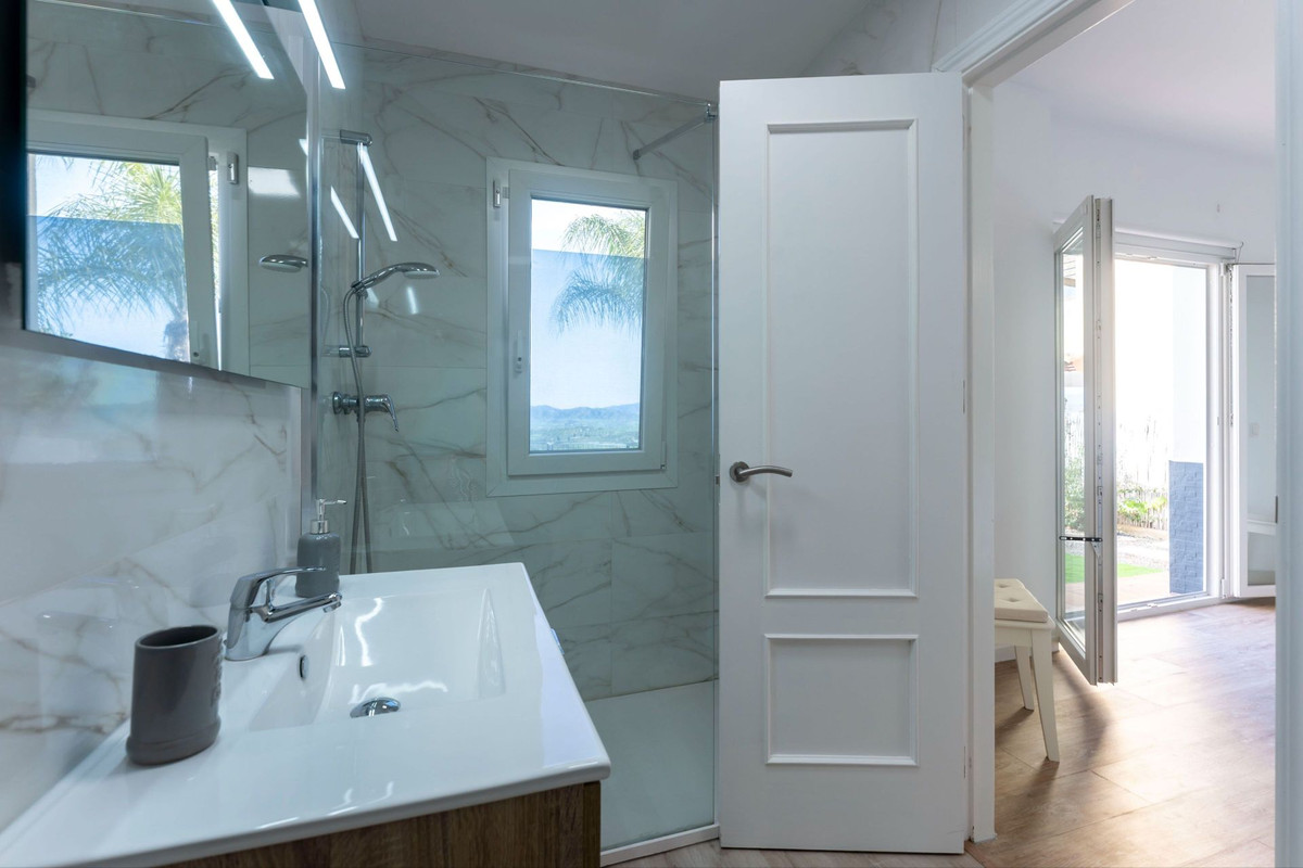 On the lower level, the property boasts a superb master suite complete with en-suite bathroom and patio doors opening directly onto the pool area. This floor also offers a second expansive living and dining space, enhanced by a striking floor-to-ceiling glass feature gas fireplace, creating a stylish division between areas while adding warmth and character. From here, floor to ceiling patios doors lead out to a covered terrace overlooking the private pool and enjoying far-reaching views towards Álora.