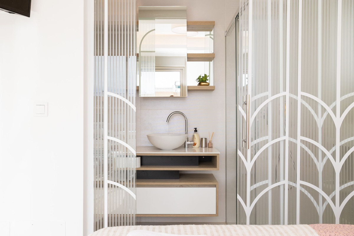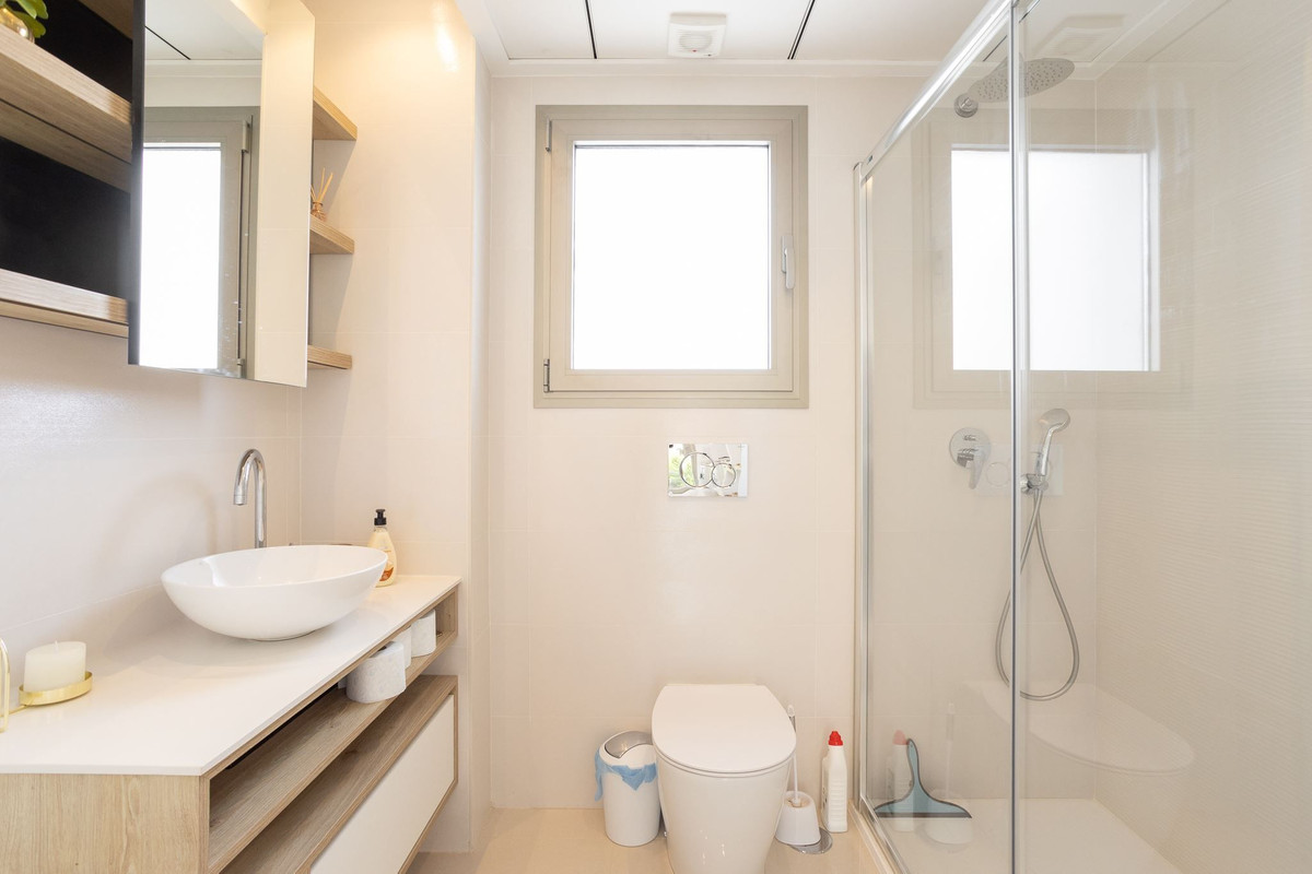 The kitchen is modern and has a smooth cabinet exterior on both upper and lower cabinets, and there is also good work surface space.