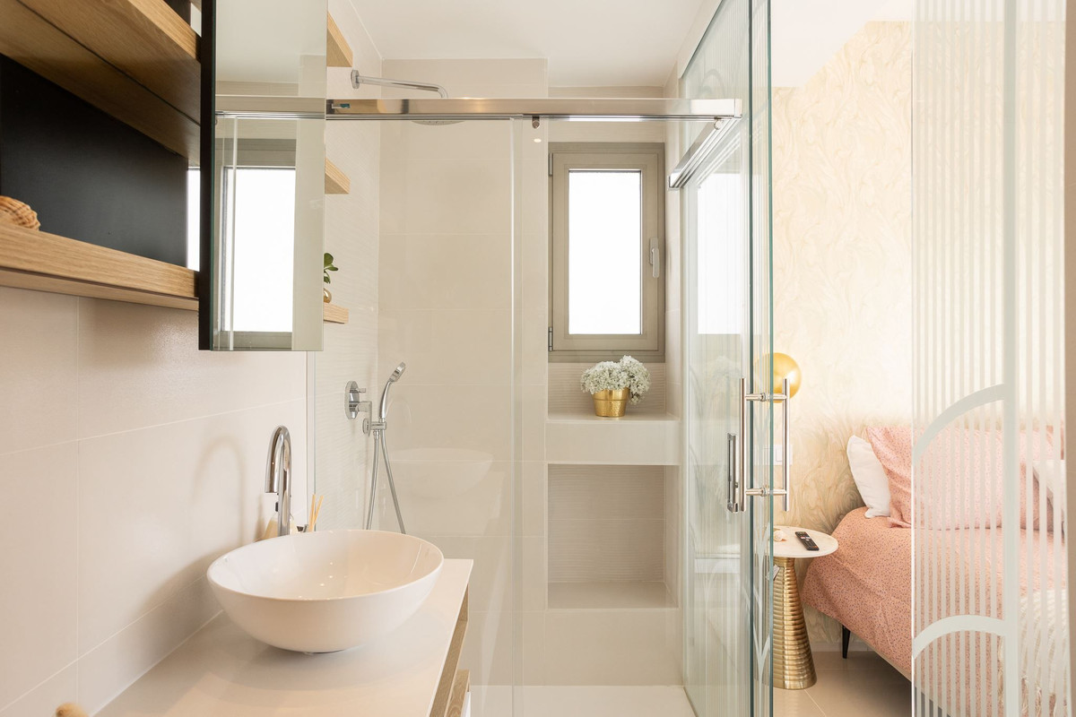 The living room and kitchen are located in an open plan and there is plenty of space for a lounge area with a sofa and TV stand, as well as a dining area for four to six people.