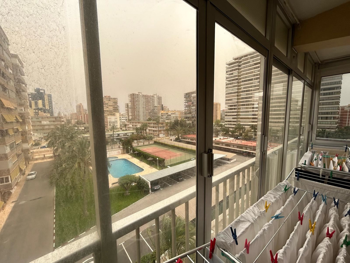 The apartment and balcony offer views of the shared pool area, Playa de San Juan and the Mediterranean Sea.