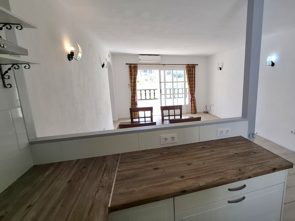 An archway from the lounge leads to a small corridor where both bedrooms and the family bathroom are located. The principal bedroom is bright and airy, with dual hot and cold air conditioning, built-in storage and a modernised en-suite bathroom featuring a walk-in shower. The second bedroom also includes fitted wardrobes and benefits from double glass and wooden doors that open onto a small balcony, again enjoying the attractive countryside views.