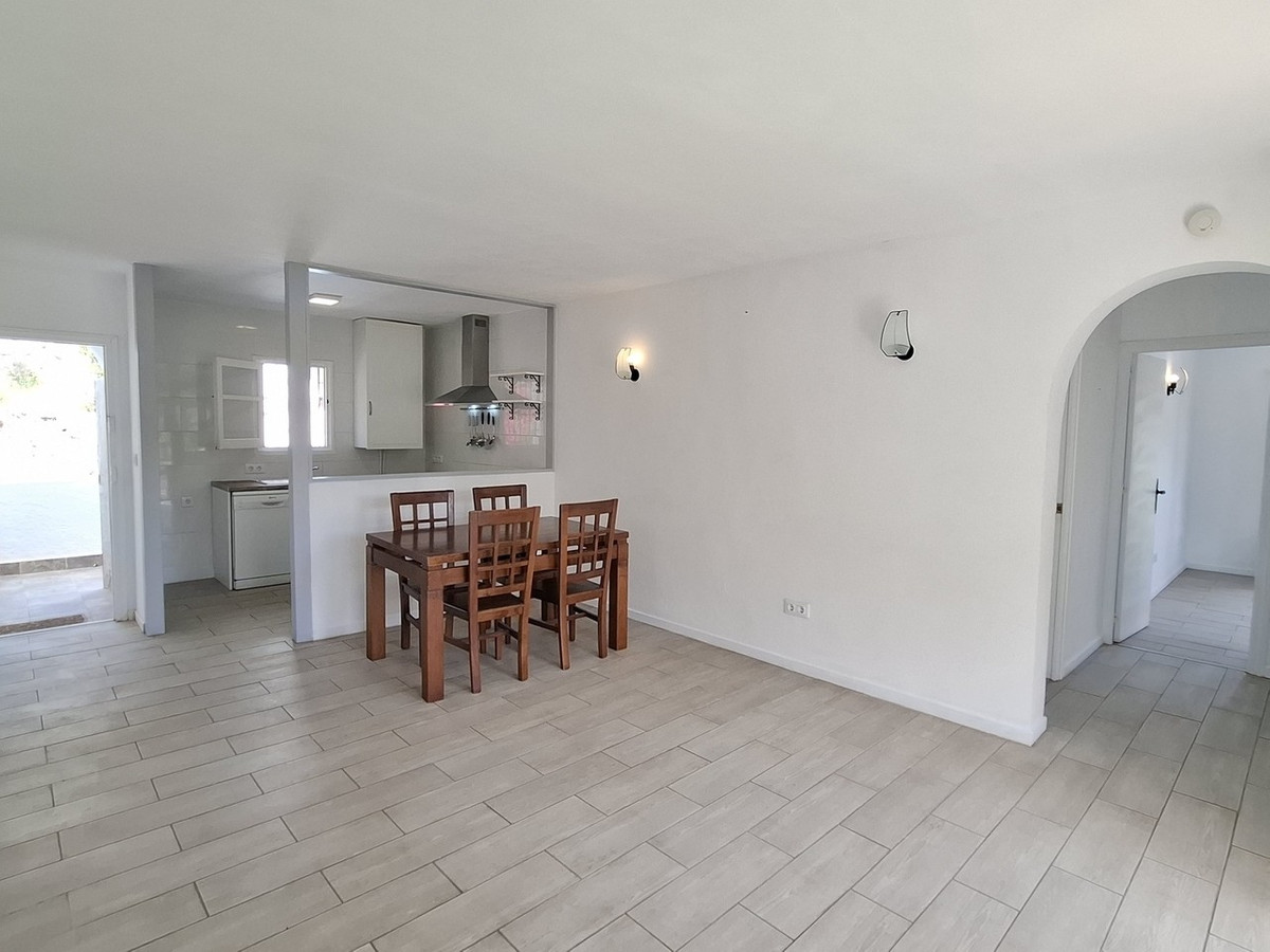 The main entrance to the property opens into a spacious and light-filled lounge diner with a semi open-plan kitchen. The lounge diner features large glass patio doors leading out to a generous terrace, ideal for outdoor dining, relaxing with a cool drink, or enjoying a barbecue. The living area is equipped with dual hot and cold air conditioning.