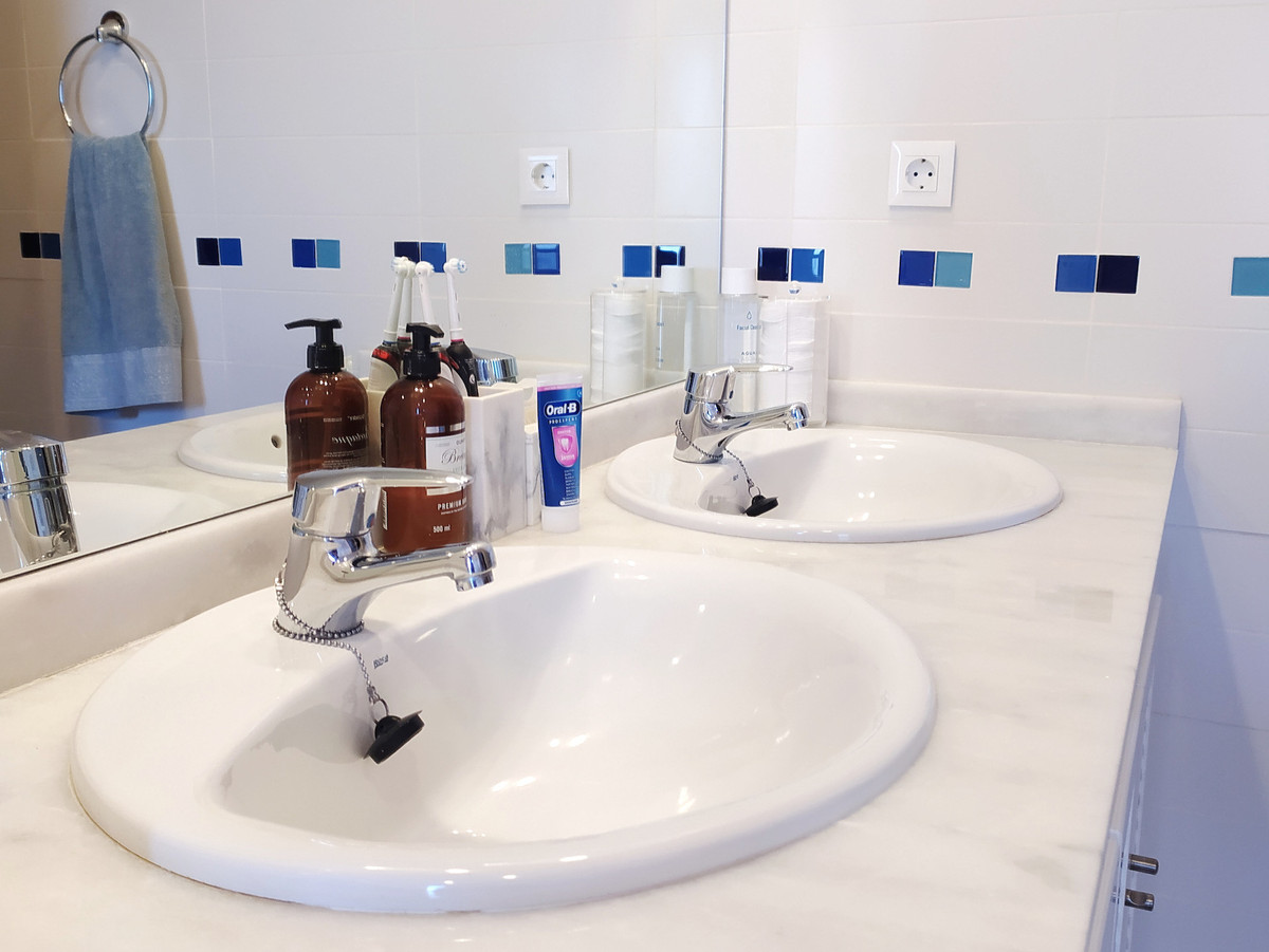 Upstairs are two additional bedrooms, both with en-suite bathrooms. One bedroom offers a fantastic view of the sea and the Pink Lake—a vista that adds a special touch to every morning. On the top floor is the large rooftop terrace with stunning views and a comfortable sun lounger for relaxing.