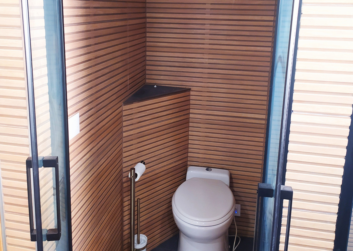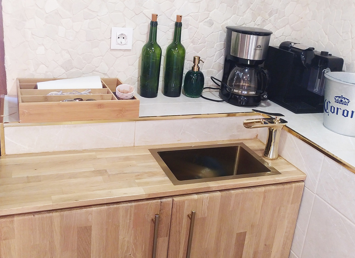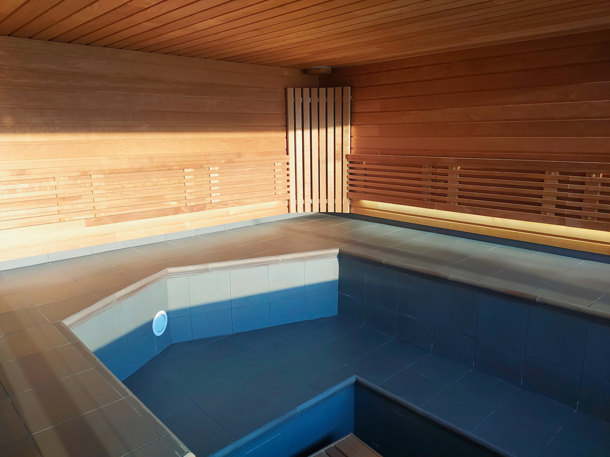 The villa's private spa area opens directly onto the large garden below the villa. Here you'll find a spacious sauna with outstanding views, a shower, a small kitchen with a refrigerator, and a restroom—all designed to create an exclusive spa experience right at home. Outside the sauna, you'll find an inviting hot tub where you can relax while enjoying beautiful starry evenings. The large patio also offers plenty of space for both quiet evenings and festive gatherings.