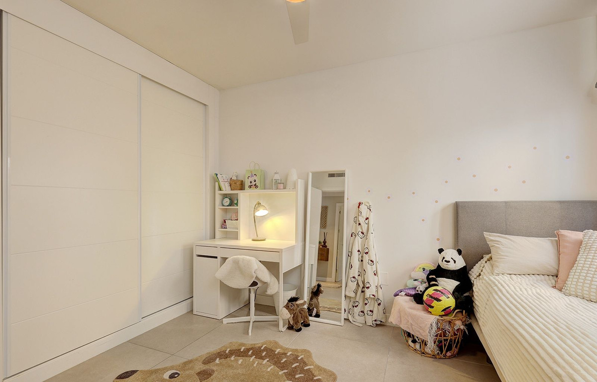 The main bedroom features an en-suite bathroom and direct access to the terrace, while the spacious additional bedrooms are fitted with built-in wardrobes. The property is finished to a high standard throughout, including ceramic tile flooring, hot and cold air conditioning, underfloor heating, a smoke detection system, and an integrated alarm system.