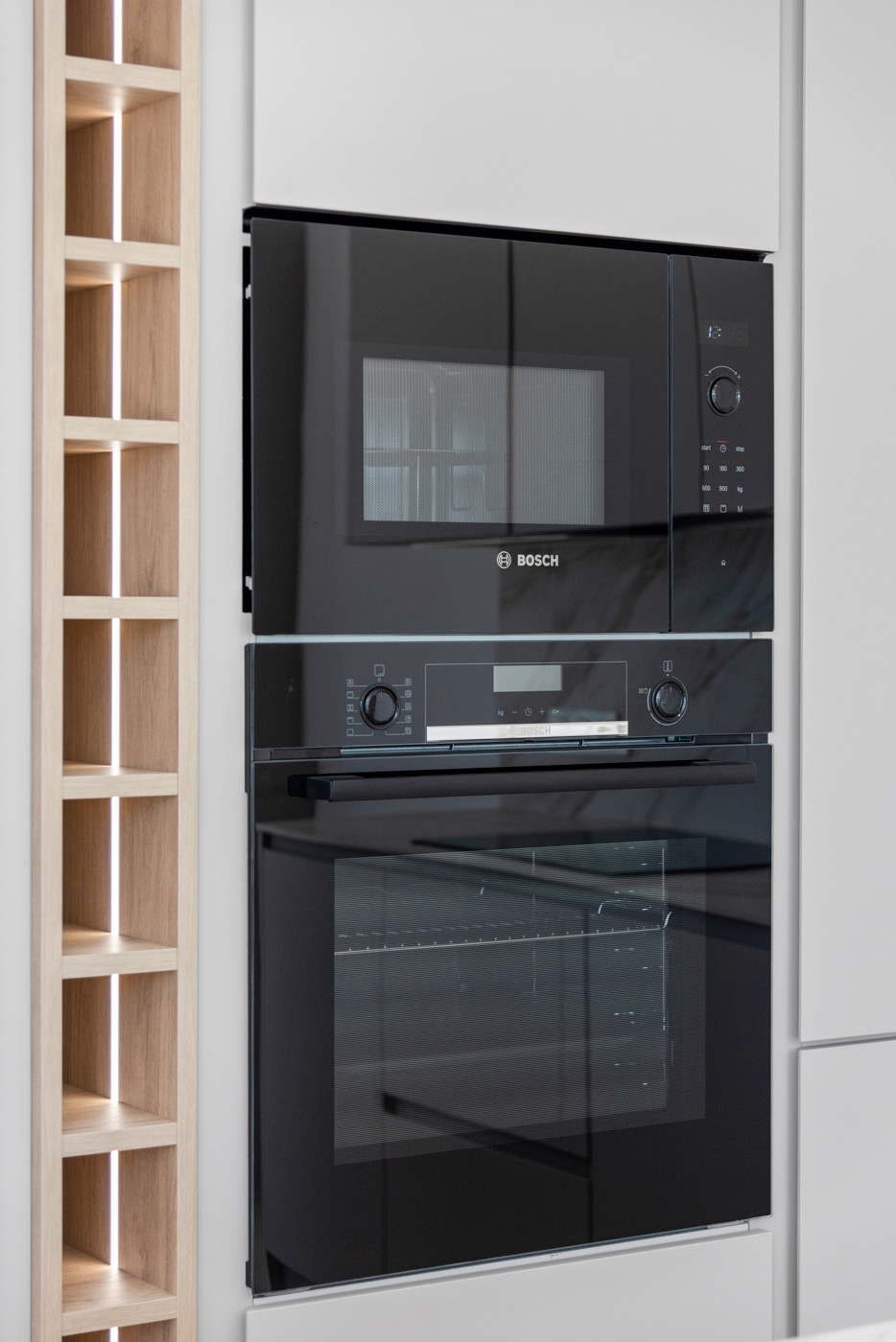 Køkkenområderne er et højdepunkt i designet, med moderne køkkenelementer og holdbare porcelænsbordplader i stort format.