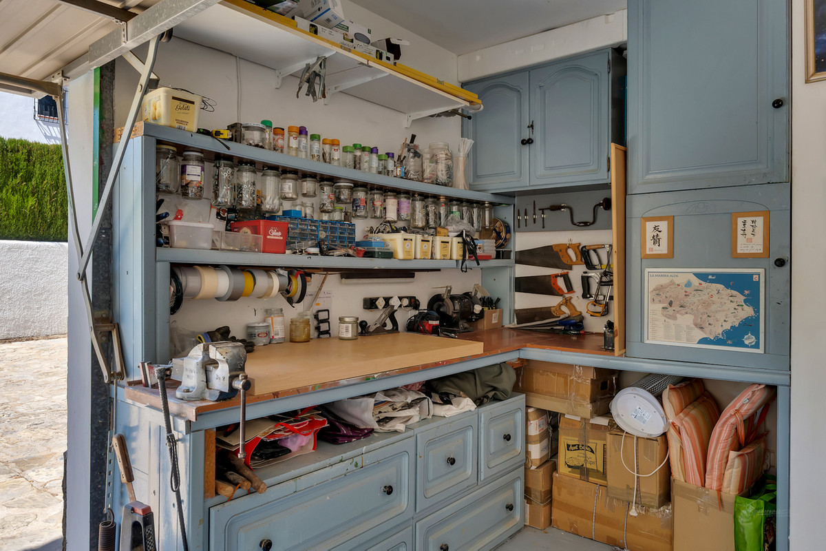 A standout feature is the 22 m² summer kitchen, fully fitted and enclosed with a roller blind. It comes with a bar, cooking area, and a large dining table to provide everything you need to host family gatherings and summer parties. The 8 x 4 m swimming pool, which includes an outdoor shower, has open terrace for sunbathing and stunning views from every aspect. Also to the outside; a garage (currently used as a workshop or hobby space), a carport and additional parking for several vehicles. Furthermore, to the lower level, there is an extra storage area. The Mediterranean garden benefits from an automatic irrigation system.