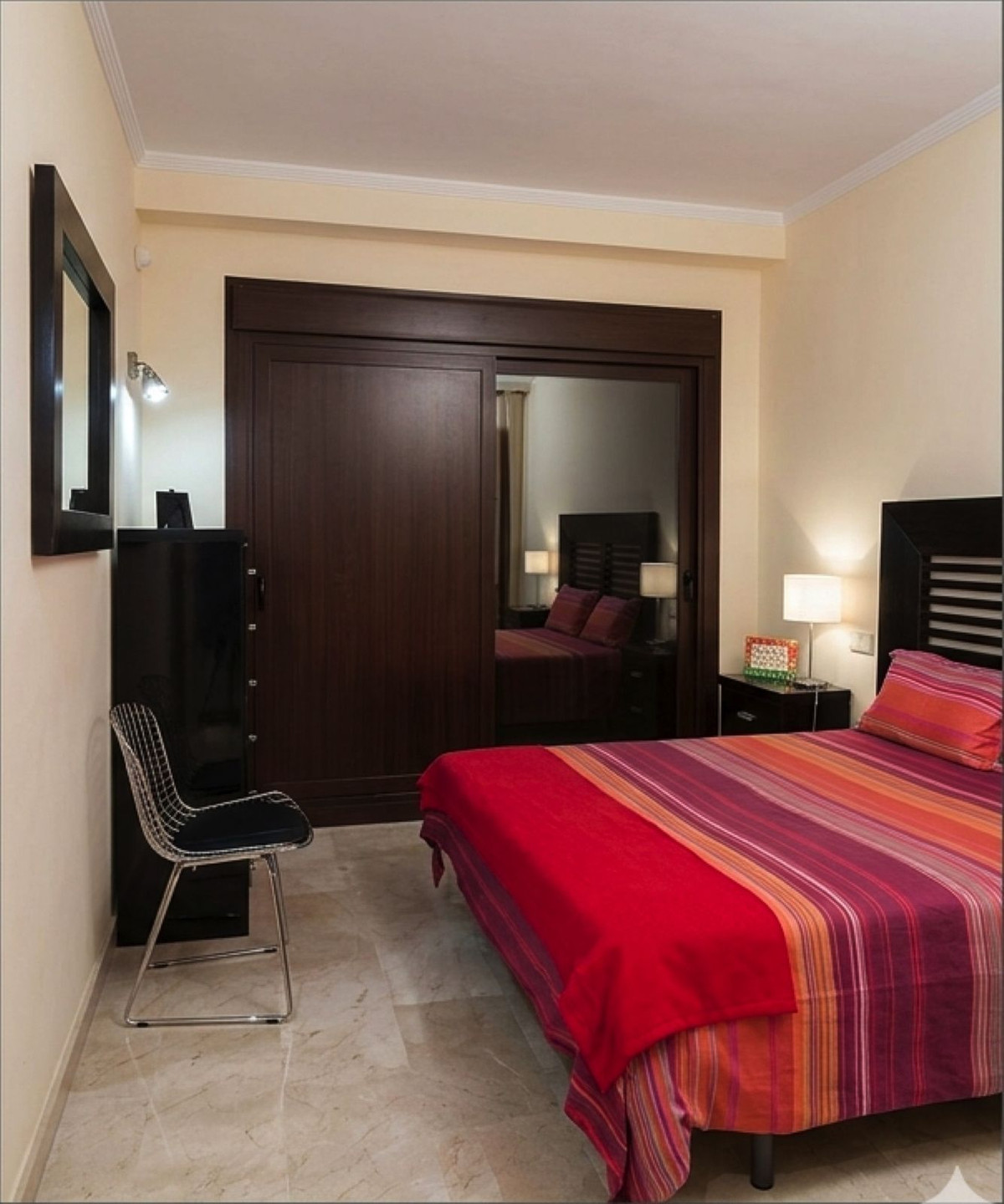The apartment features two spacious bedrooms and two bathrooms, including an elegant en-suite with double sinks, bidet and a hydromassage bathtub, creating a private retreat within the home. The fully fitted kitchen is equipped with high-quality appliances and designed for both practicality and style, while built-in wardrobes with interior fittings add to the sense of organisation and comfort.