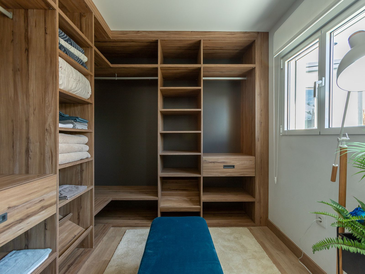 Upstairs there are 3-4 bedrooms and two modern bathrooms. The master bedroom has a spacious walk-in closet, as well as a modern study, which not only has its own relaxation area with sofa and television, but also its own small kitchenette. From the master bedroom you have access to a west-facing balcony with steps down to the pool and chill-out area.
