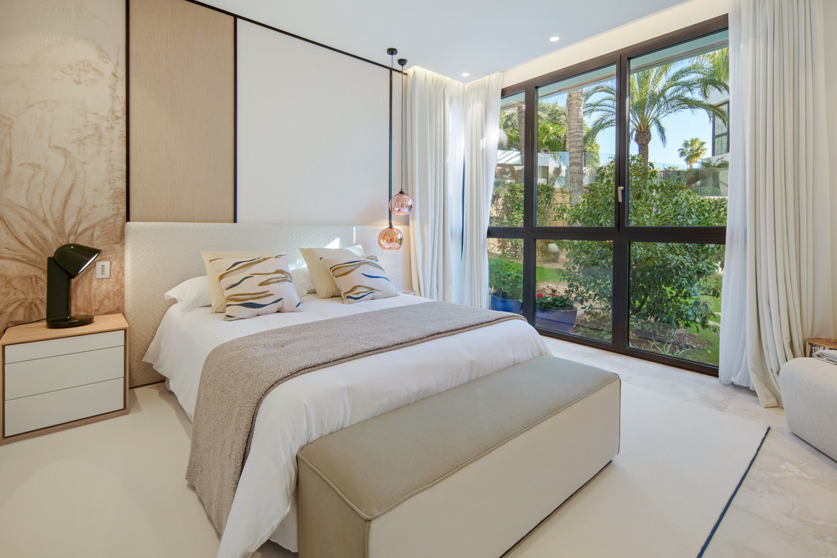 Atlas is a duplex ground-floor apartment in Reserva de Sierra Blanca offering four bedrooms, four bathrooms plus a guest cloakroom, arranged over a discreet entertainment level below and a calm main living floor above, with interiors by Pedro Peña, bespoke carpentry by Vaneva, technical installations by Proinsermant, climate systems by Technoclima, and a private terrace with garden and pool outlook, plus two internally accessed parking spaces.