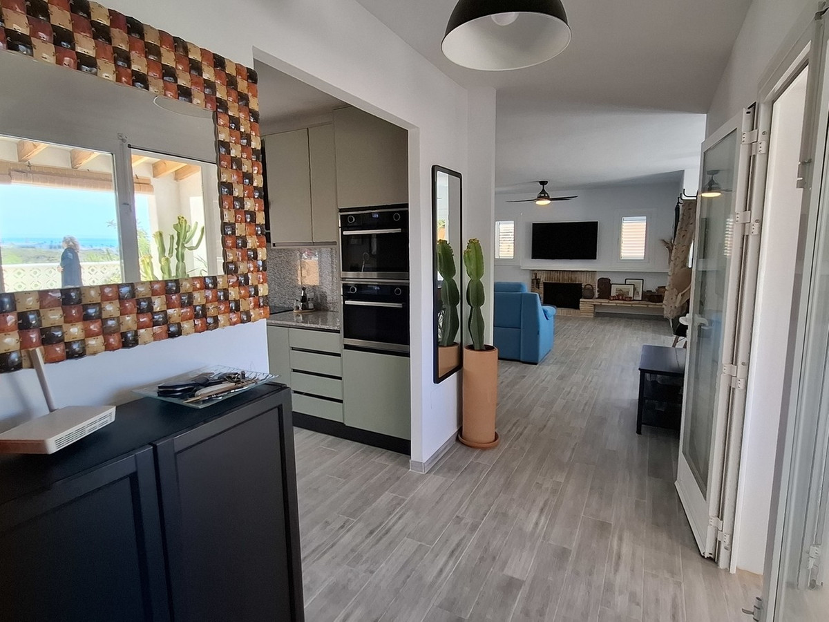 From the living area, an internal staircase leads to the first floor, where the impressive principal bedroom is located. This expansive room offers breathtaking sea and mountain views, access to a private terrace, and a large en-suite bathroom with a corner shower.