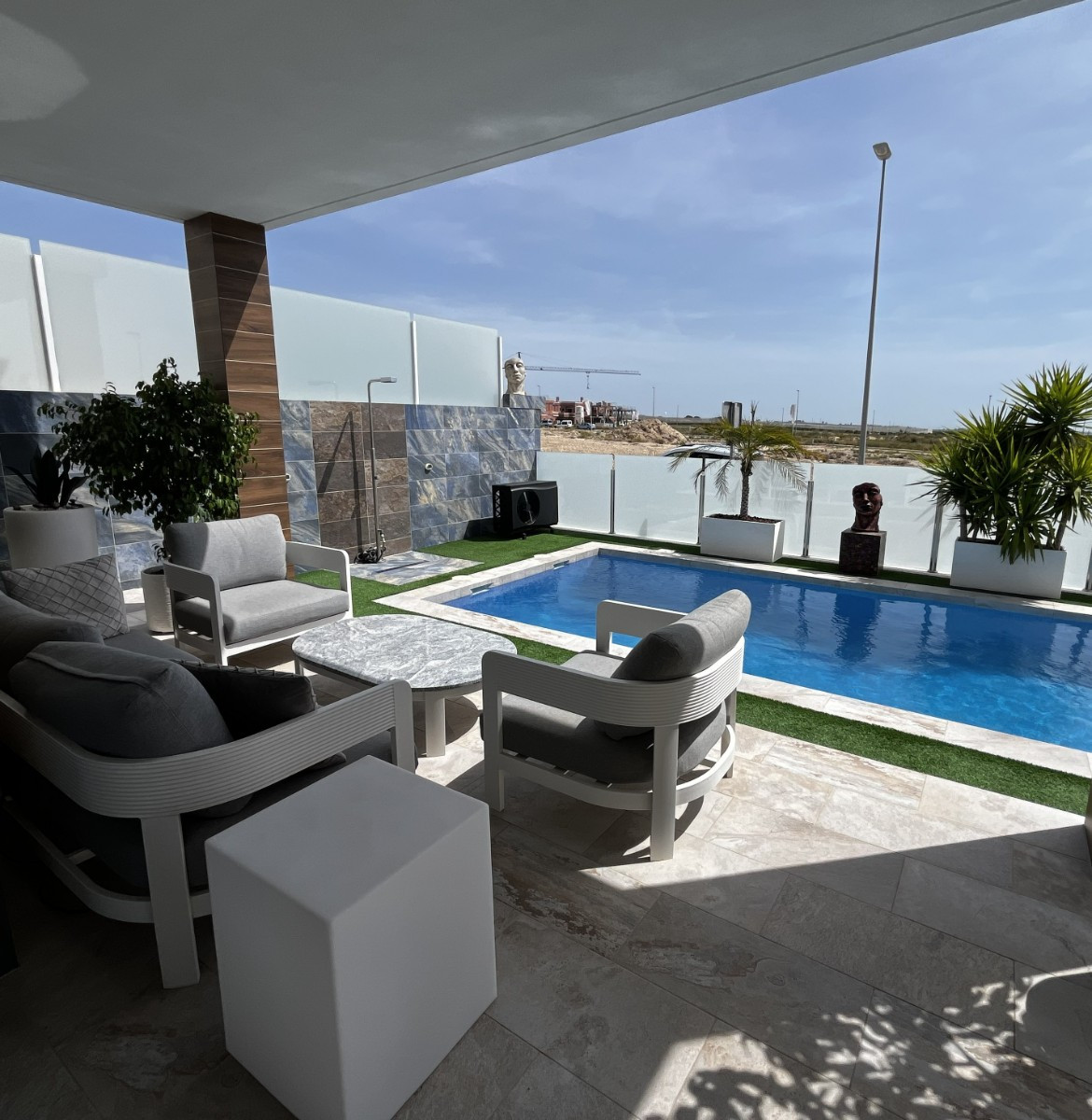 The private 4.50 x 7.50 metre swimming pool, with automatic salt system, Redox control equipment for total pool management, automatic water refill and heating/cooling system, allows year-round swimming, even at 30 degrees, transforming the outdoor space into a true private oasis.