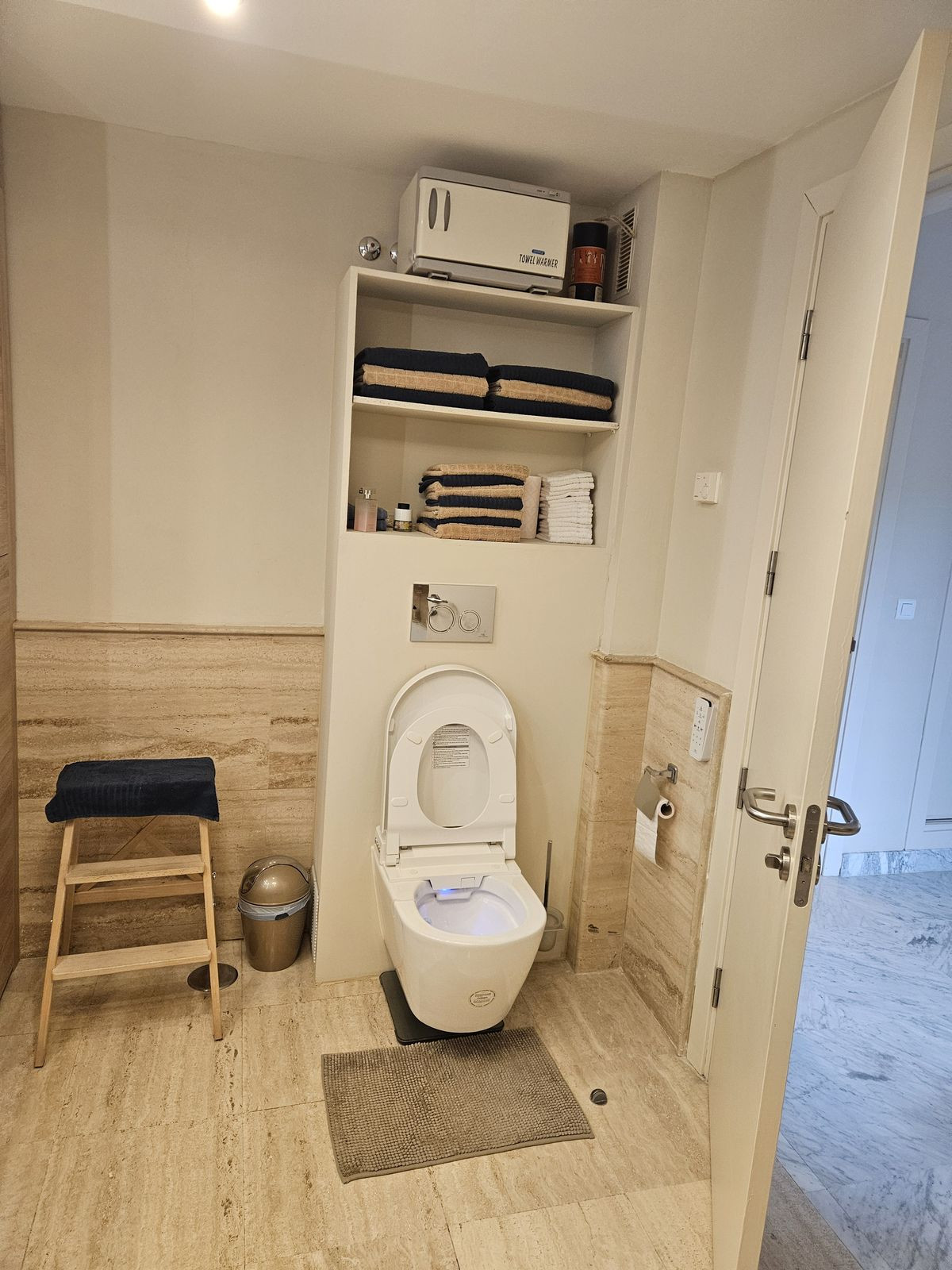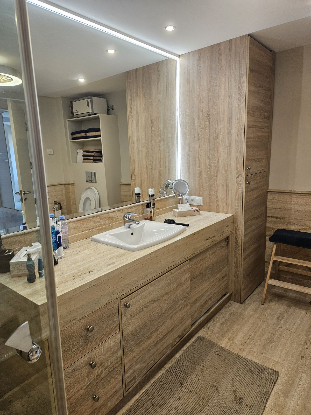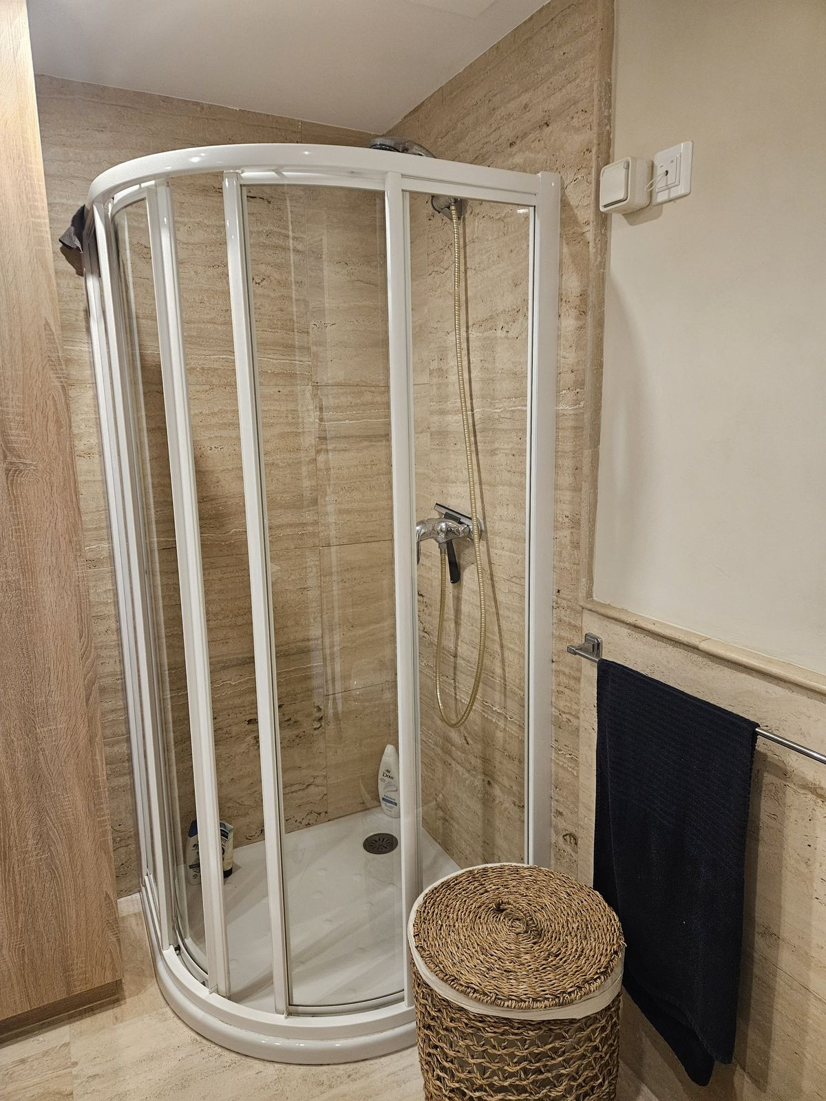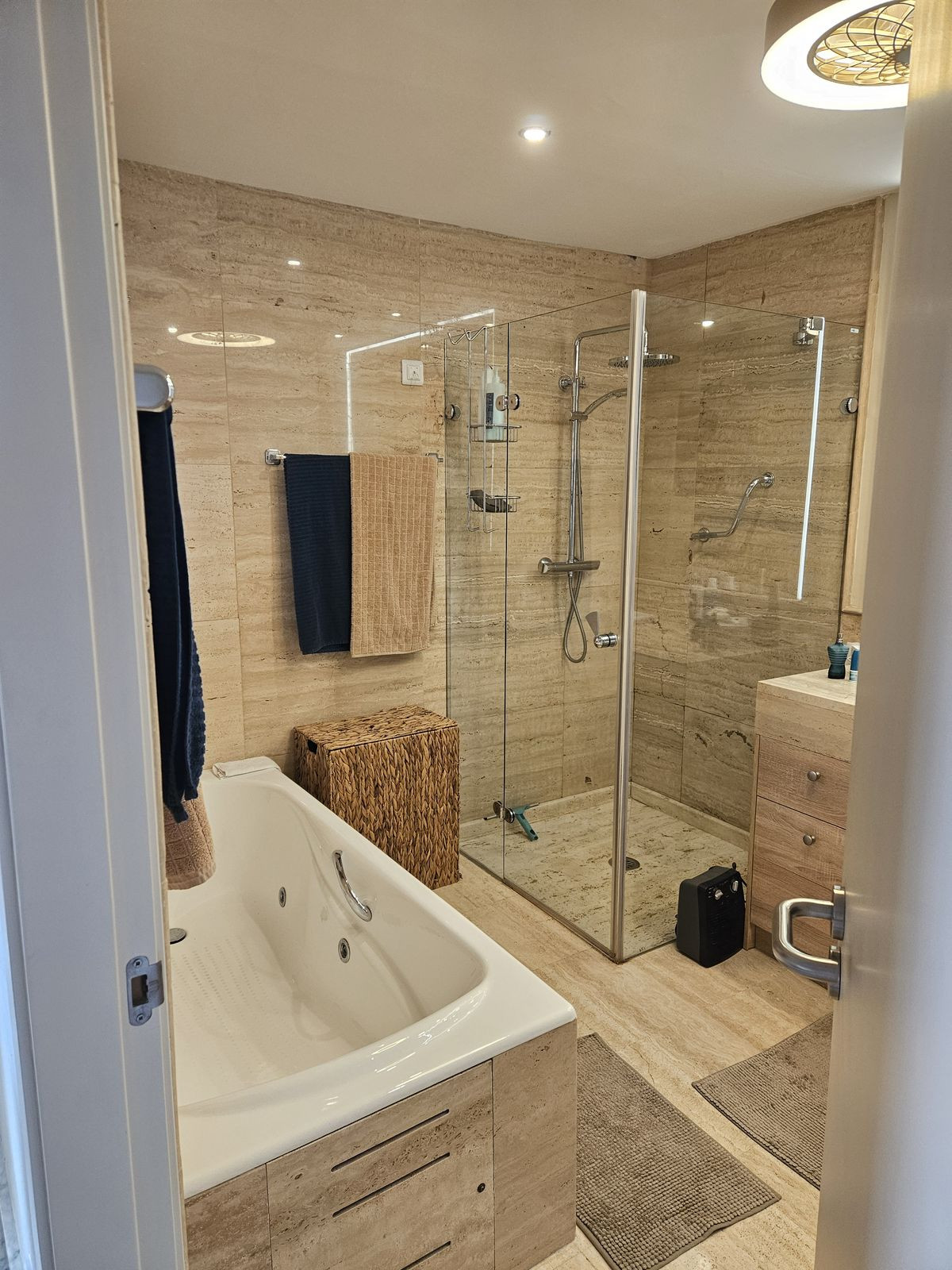 Lejligheden har 2 rummelige soveværelser, hver med eget badeværelse for maksimal privatliv og komfort. Det store soveværelse er udstyret med store indbyggede skabe og har både en terrasse foran og bagved – ideelt til at nyde solen på ethvert tidspunkt af dagen. Gæstesoveværelset har også et praktisk indbygget skab.