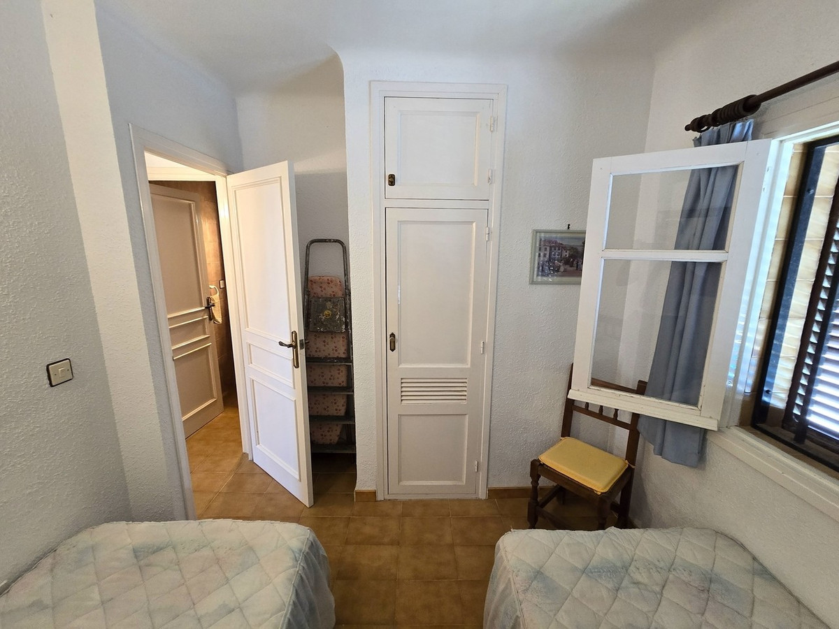 Upstairs, the property continues to impress with two further bedrooms. One is another twin room, also equipped with built-in wardrobes, making it ideal for guests or family members. The main bedroom is a generous double, offering direct access to a private balcony. This outdoor space comfortably accommodates a table and chairs, making it an ideal place to enjoy morning coffee or evening sunsets. From here, the views are particularly attractive, stretching from the sparkling sea across to the surrounding mountains.