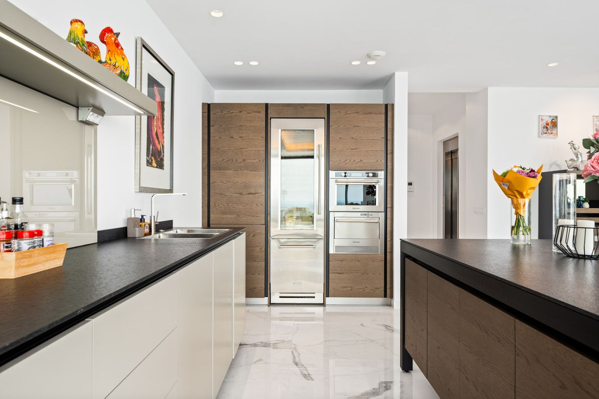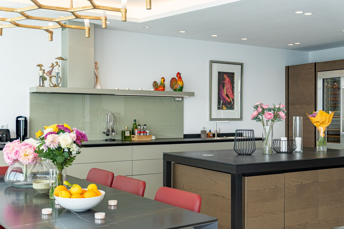 The elegant living area is a spacious, open-plan space, where the living room, dining room, and designer kitchen by Italian brand Molteni Dada create a cohesive, elegant whole. Exclusive Molteni & C furniture and top-quality finishing materials complete the design. A fully integrated Sonos audio system delivers outstanding sound throughout every room.