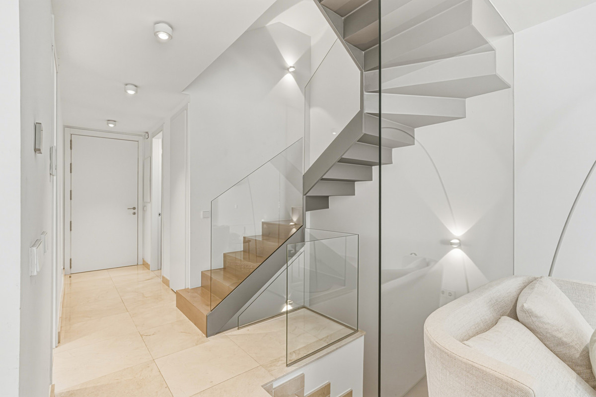 Stueetagen har en lys åben plan stue og spiseplads med et moderne fuldt udstyret køkken, åbning på en privat have med direkte adgang til den fælles pool, hvilket skaber en ideel indendørs-udendørs livsstil. Dette niveau indeholder også et gæsteværelse og et fuldt badeværelse. På første sal har ejendommen en rummelig master suite med privat terrasse, to ekstra gæsteværelser og et stilfuldt fælles badeværelse. Det øverste niveau fører til et generøst privat solarium, komplet med et grillområde og plunge pool, perfekt til afslappende eller underholdende. Det lavere niveau giver et stort multipurpose rum, ideel til et fitnesscenter eller spil rum, sammen med et vaskeri rum, opbevaringsområde og direkte intern adgang til garagen. Yderligere funktioner omfatter varm og kold aircondition, to private parkeringspladser og concierge-service. Denne ejendom tilbyder en perfekt kombination af moderne design, komfort og en førsteklasses beliggenhed.