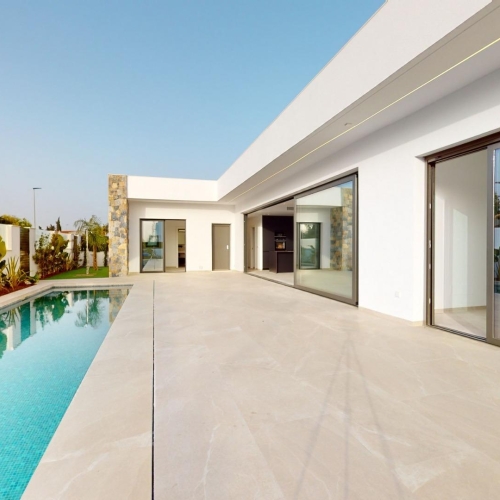 NYBYGGET VILLA I LOS ALCAZARES Smuk nybygget villa i Los Alcazares. Denne villa designet med lige linjer bygget over 2 etager og indeholder 3 soveværelser, 3 badeværelser, åbent køkken med stue-spisestue, solarium, privat have, swimmingpool og parkeringsplads. Villaer beliggende tæt på alle former for tjenester, kommercielle centre, lufthavne, hospitaler, fritidsområder osv. Los Alcázares beliggende i regionen Murcia nær strandene i Mar Menor. Her kan du praktisere forskellige vandsport, omgivet af flere golfbaner og byen Cartagena mindre end 15 minutter i bil og 22 km fra Murcia lufthavn, og har derfor et bredt kulturelt, gastronomisk og sportsligt tilbud inden for rækkevidde.