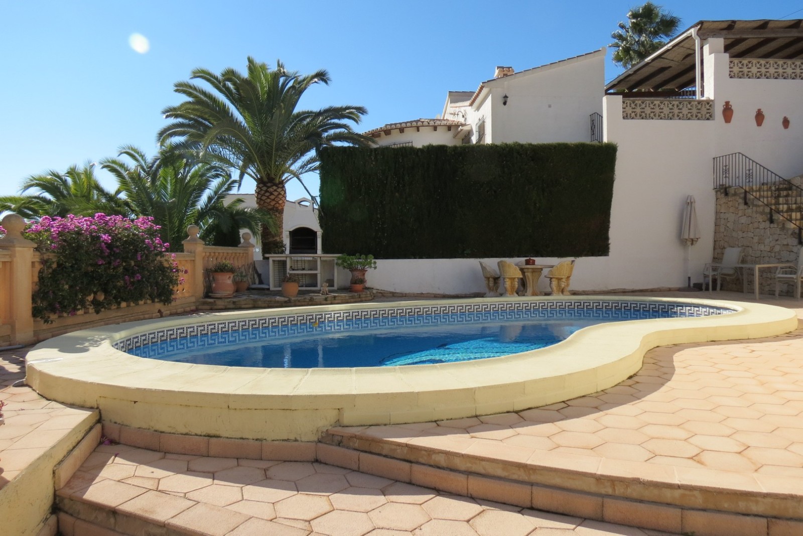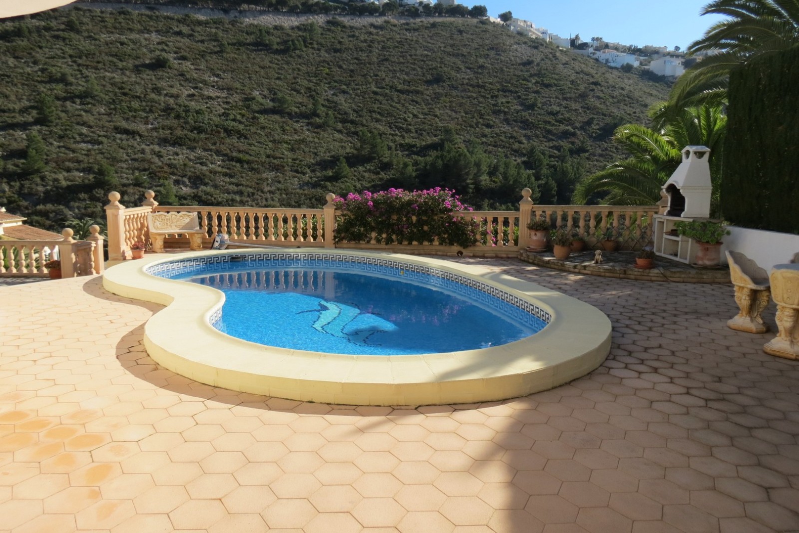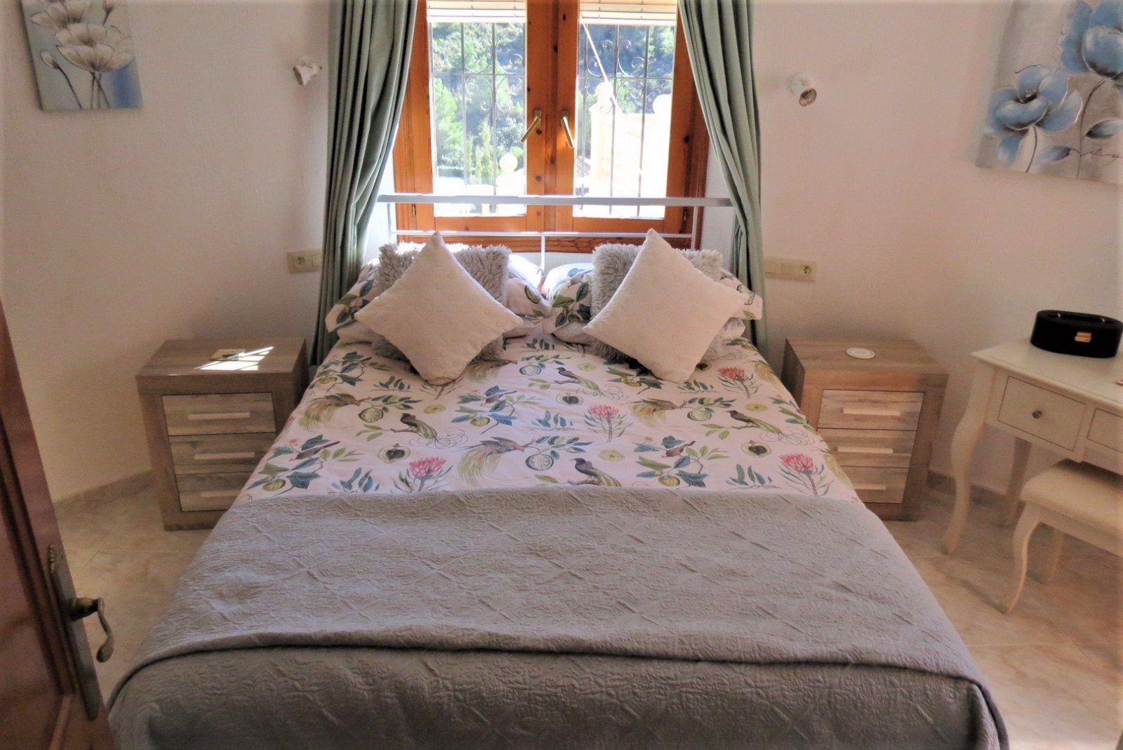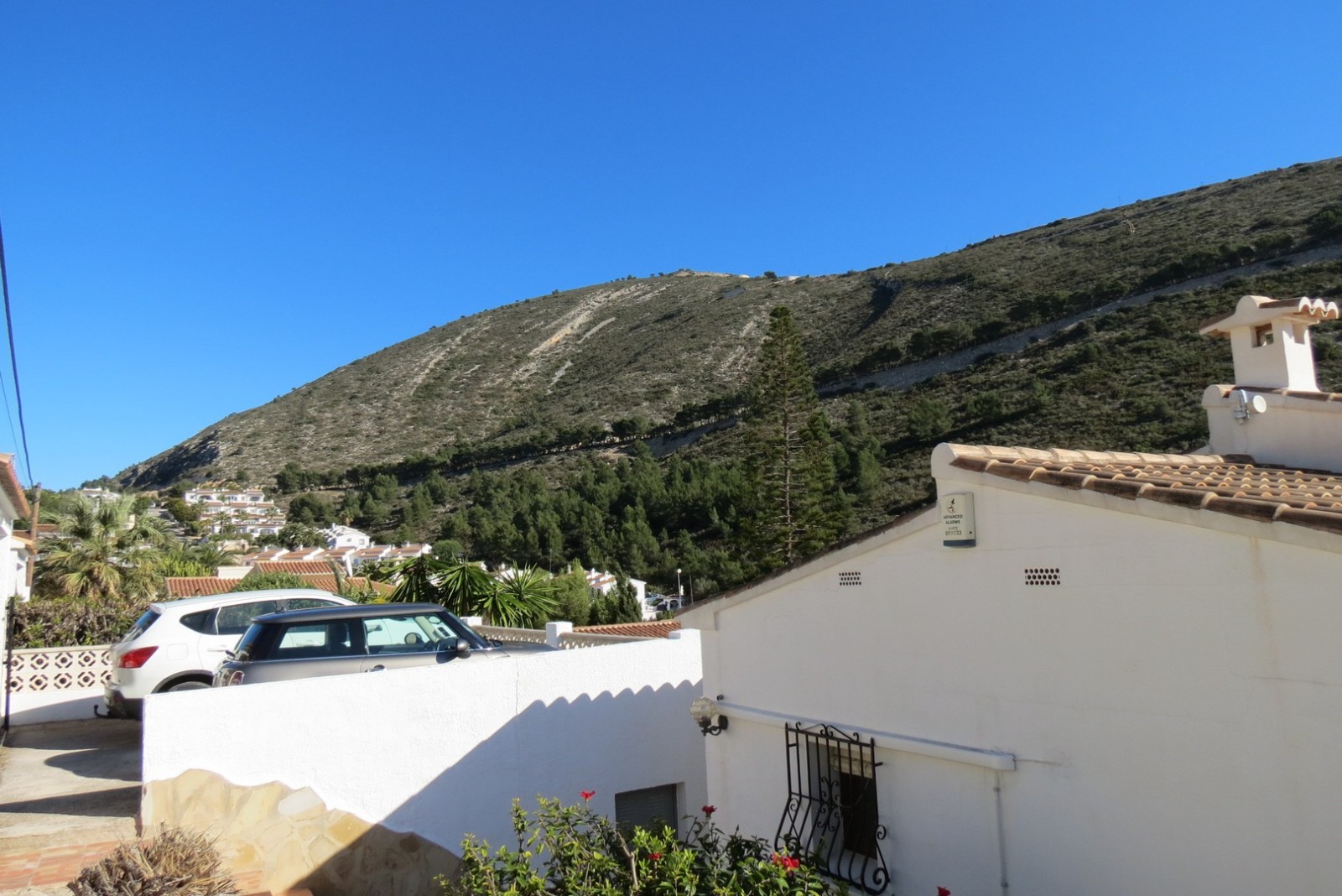 This lovely villa for sale in Valle del Portet, on the outskirts of Moraira, offers beautiful views to the green zone hills and all the way down to the sea at El Portet beach. The property is conveniently located just 1.2km to a shopping centre, 4.1km to El Portet beach and 4.7km to Moraira town centre. At street level the property has a gated parking area for two cars and then a few steps down to the main living level of the villa. You enter the villa through the open naya and then into the open plan living area which consists of a luminous living area with feature fireplace and woodburner, a dining area between the kitchen and the naya and an open kitchen with pale wood effect units and Rosa Porrino granite worktops.To the left of the living area is a spacious double bedroom with built-in wardrobes and the house bathroom which includes a shower. Down the internal staircase you reach a small hallway, to the left is a double bedroom which has a dressing area and an en-suite bathroom with vanity unit and walk-in shower. Further down the hallway to the left is a bright large bedroom with built-in wardrobes and a glazed door leading out to the pool terrace, opposite there is a bathroom which includes a bath with shower attachment. At the end of the hall is the fourth bedroom which is currently used as a utility room and storage room, this room also has glazed doors leading out to the pool terrace. Externally there is a semicircular terrace and open naya with lovely views outside the main living level, an easy maintenance garden area at the back of the villa, a storage room underneath parking area. There is a large pool terrace with barbecue and alfresco dining area and two steps down there is another large terrace with the pool shower, garden shed and a relaxing area perfect for the last rays of the daily sunshine. At the bottom of the garden there are two terraces with natural stone walls, the pool pump room, fruit trees and a Yucca.