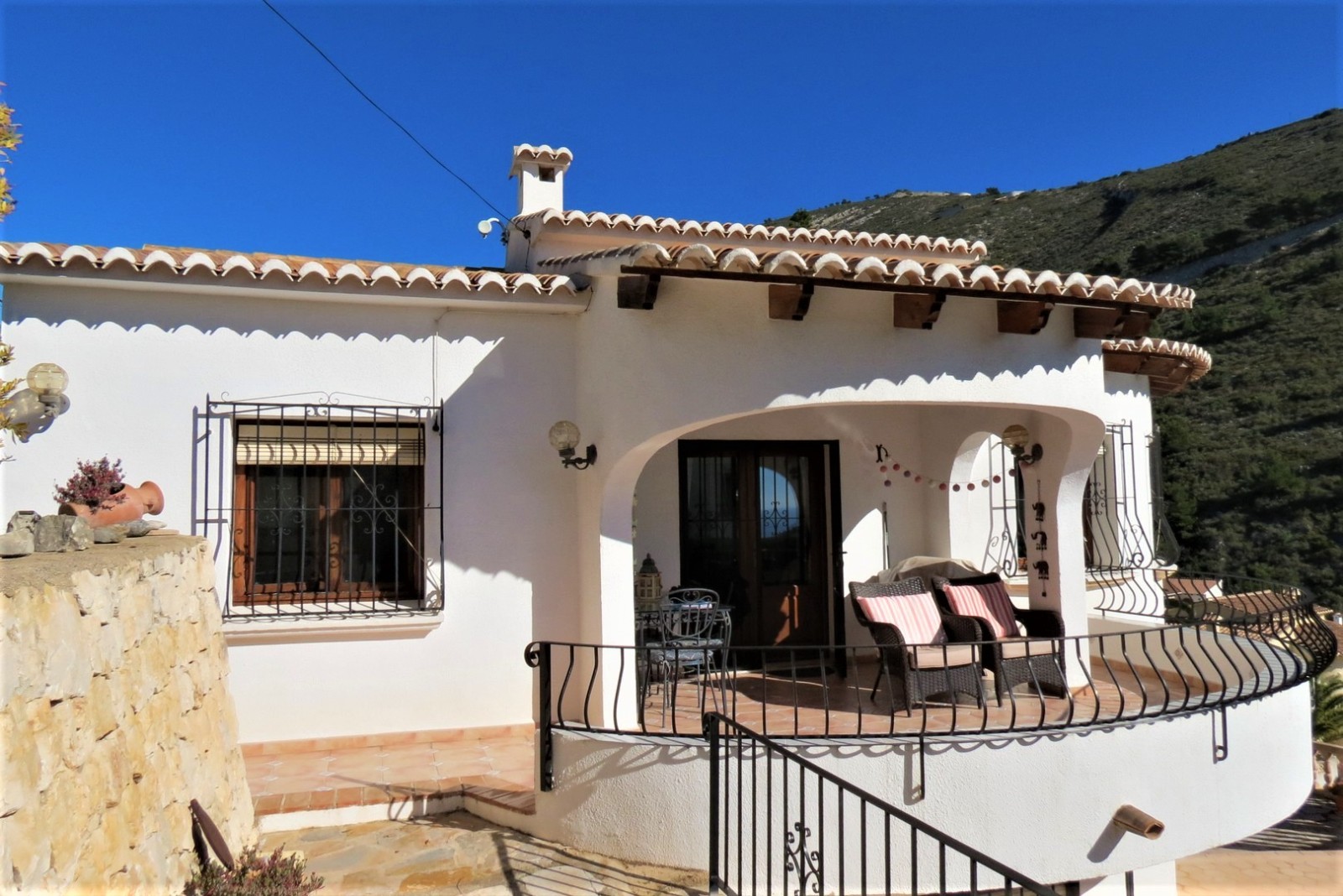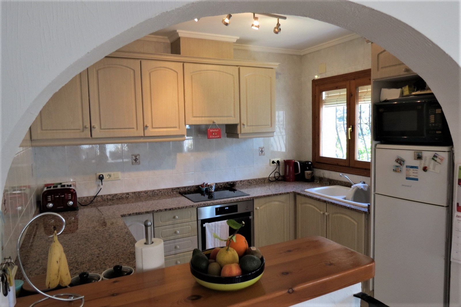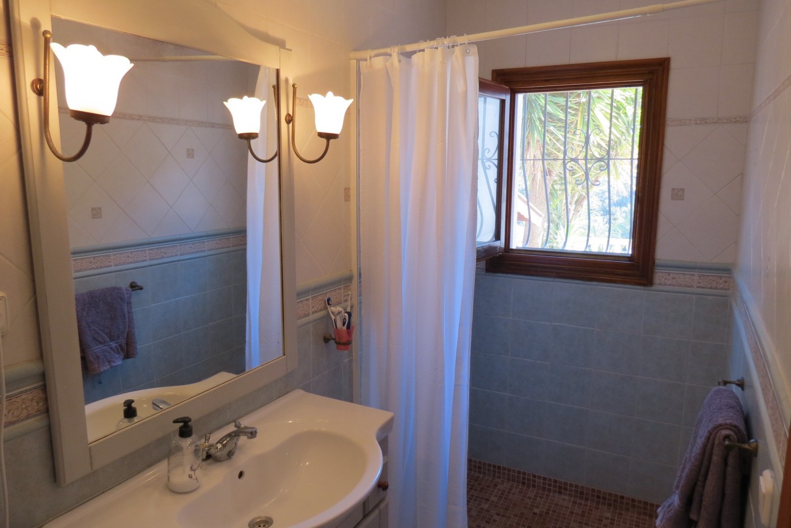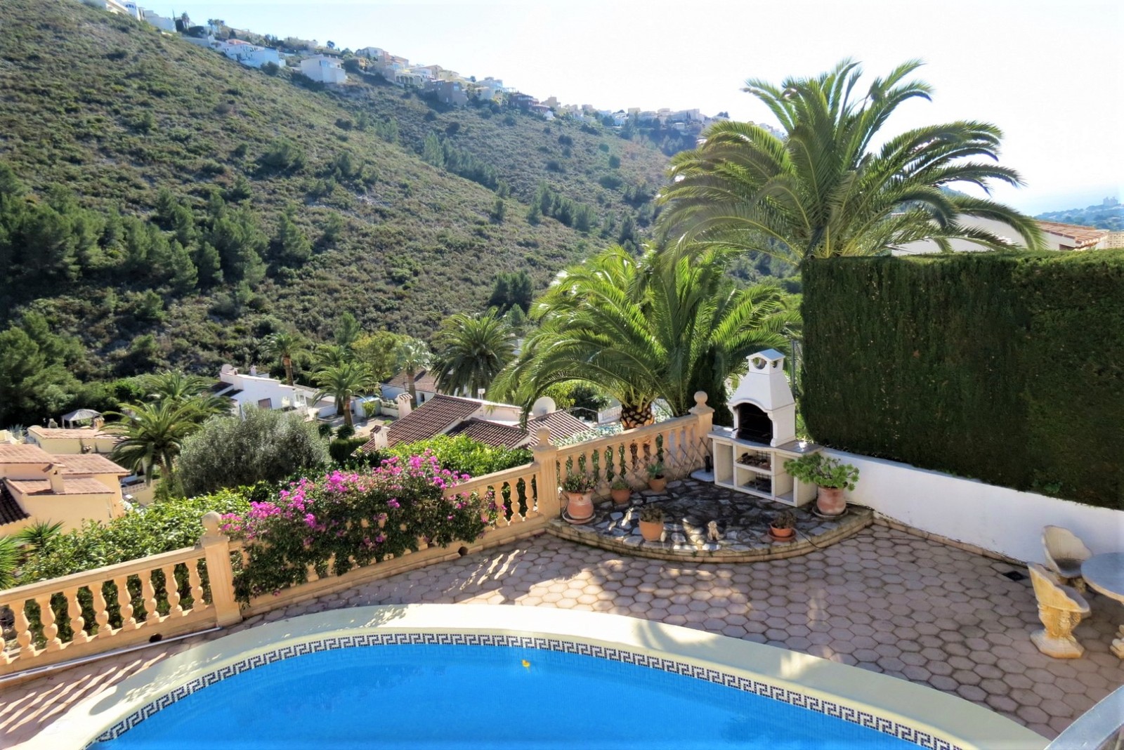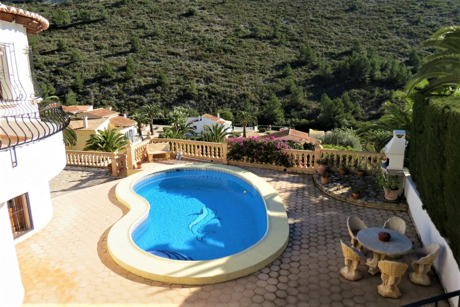 This lovely villa for sale in Valle del Portet, on the outskirts of Moraira, offers beautiful views to the green zone hills and all the way down to the sea at El Portet beach. The property is conveniently located just 1.2km to a shopping centre, 4.1km to El Portet beach and 4.7km to Moraira town centre. At street level the property has a gated parking area for two cars and then a few steps down to the main living level of the villa. You enter the villa through the open naya and then into the open plan living area which consists of a luminous living area with feature fireplace and woodburner, a dining area between the kitchen and the naya and an open kitchen with pale wood effect units and Rosa Porrino granite worktops.To the left of the living area is a spacious double bedroom with built-in wardrobes and the house bathroom which includes a shower. Down the internal staircase you reach a small hallway, to the left is a double bedroom which has a dressing area and an en-suite bathroom with vanity unit and walk-in shower. Further down the hallway to the left is a bright large bedroom with built-in wardrobes and a glazed door leading out to the pool terrace, opposite there is a bathroom which includes a bath with shower attachment. At the end of the hall is the fourth bedroom which is currently used as a utility room and storage room, this room also has glazed doors leading out to the pool terrace. Externally there is a semicircular terrace and open naya with lovely views outside the main living level, an easy maintenance garden area at the back of the villa, a storage room underneath parking area. There is a large pool terrace with barbecue and alfresco dining area and two steps down there is another large terrace with the pool shower, garden shed and a relaxing area perfect for the last rays of the daily sunshine. At the bottom of the garden there are two terraces with natural stone walls, the pool pump room, fruit trees and a Yucca.