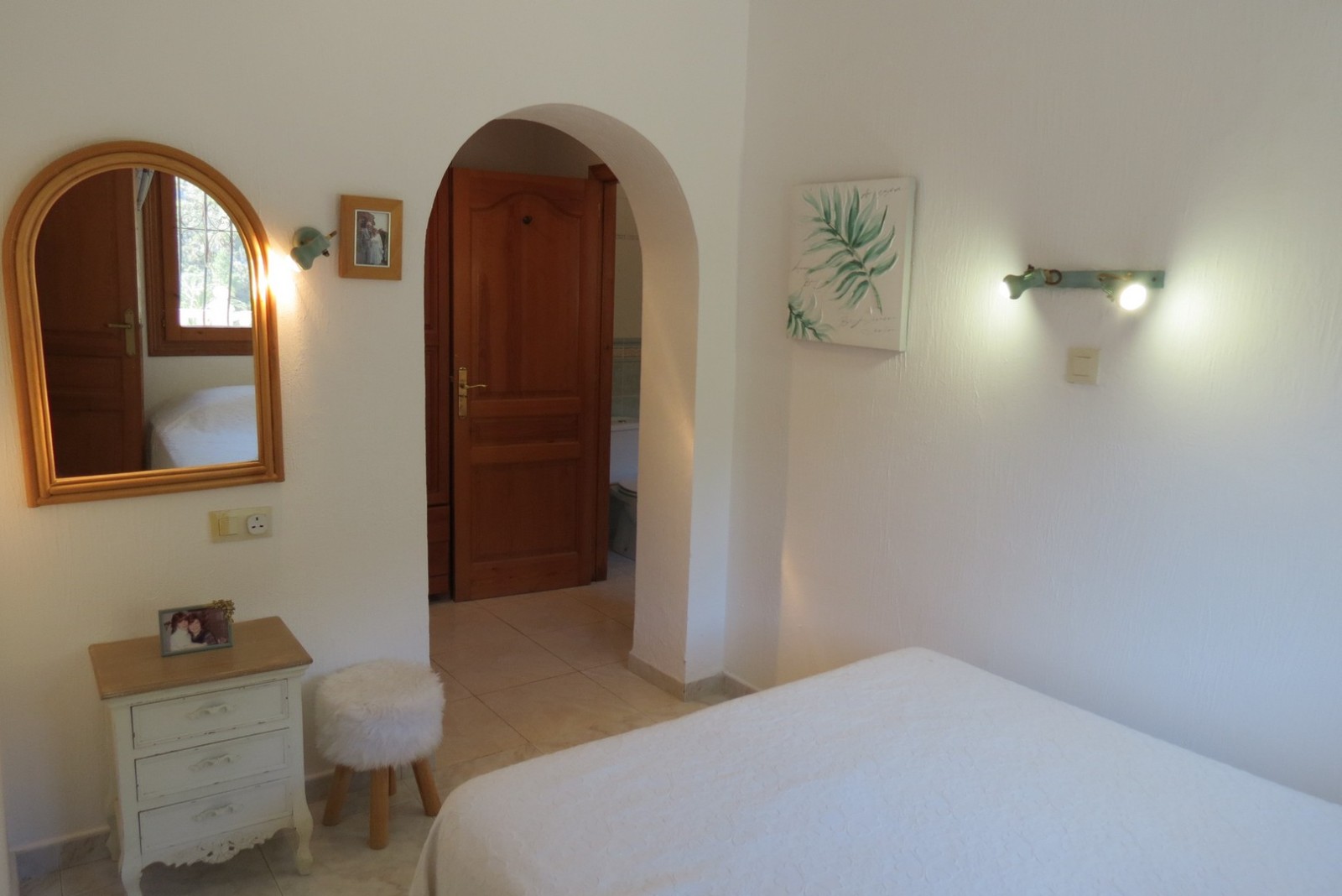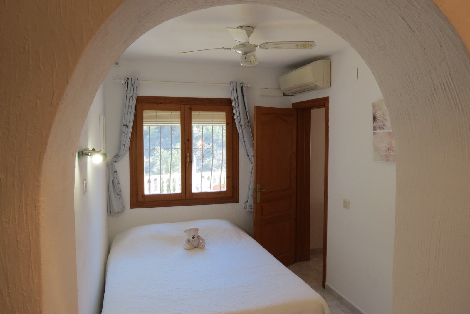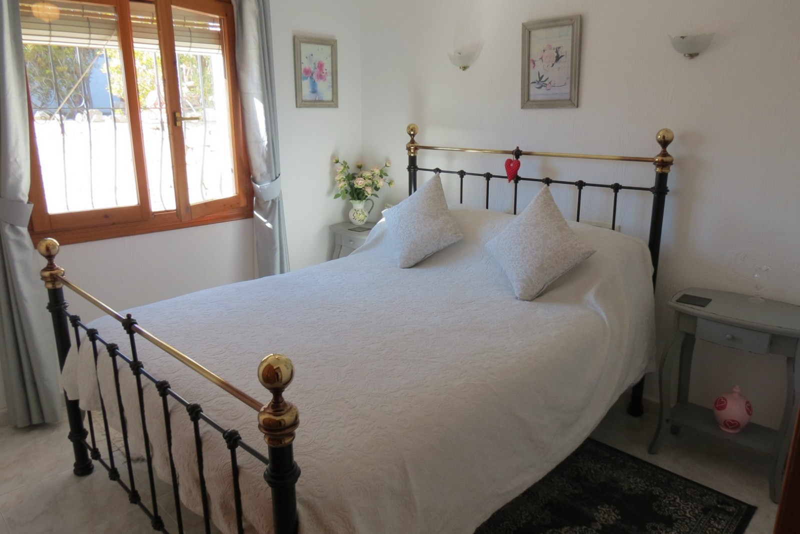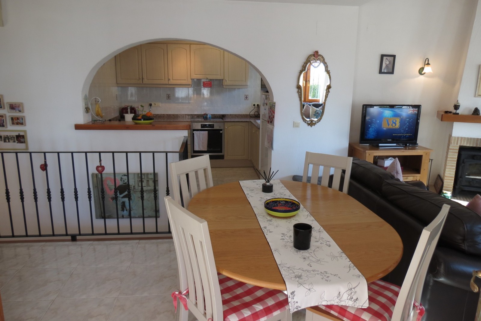 This lovely villa for sale in Valle del Portet, on the outskirts of Moraira, offers beautiful views to the green zone hills and all the way down to the sea at El Portet beach. The property is conveniently located just 1.2km to a shopping centre, 4.1km to El Portet beach and 4.7km to Moraira town centre. At street level the property has a gated parking area for two cars and then a few steps down to the main living level of the villa. You enter the villa through the open naya and then into the open plan living area which consists of a luminous living area with feature fireplace and woodburner, a dining area between the kitchen and the naya and an open kitchen with pale wood effect units and Rosa Porrino granite worktops.To the left of the living area is a spacious double bedroom with built-in wardrobes and the house bathroom which includes a shower. Down the internal staircase you reach a small hallway, to the left is a double bedroom which has a dressing area and an en-suite bathroom with vanity unit and walk-in shower. Further down the hallway to the left is a bright large bedroom with built-in wardrobes and a glazed door leading out to the pool terrace, opposite there is a bathroom which includes a bath with shower attachment. At the end of the hall is the fourth bedroom which is currently used as a utility room and storage room, this room also has glazed doors leading out to the pool terrace. Externally there is a semicircular terrace and open naya with lovely views outside the main living level, an easy maintenance garden area at the back of the villa, a storage room underneath parking area. There is a large pool terrace with barbecue and alfresco dining area and two steps down there is another large terrace with the pool shower, garden shed and a relaxing area perfect for the last rays of the daily sunshine. At the bottom of the garden there are two terraces with natural stone walls, the pool pump room, fruit trees and a Yucca.