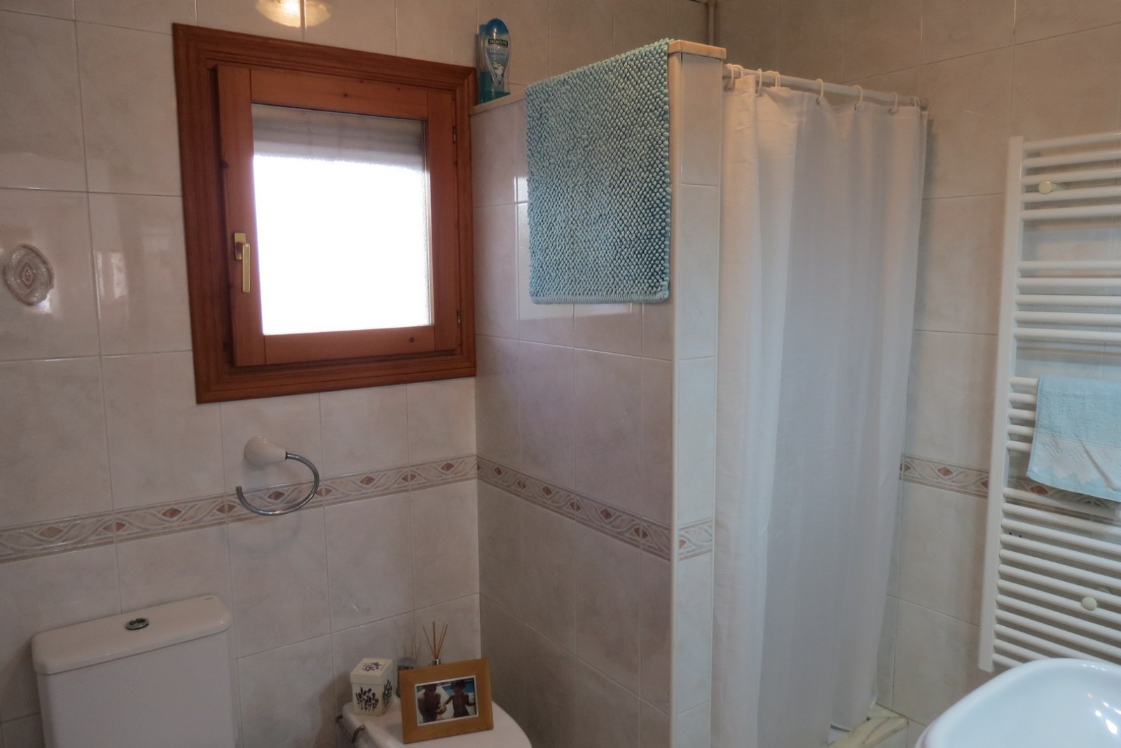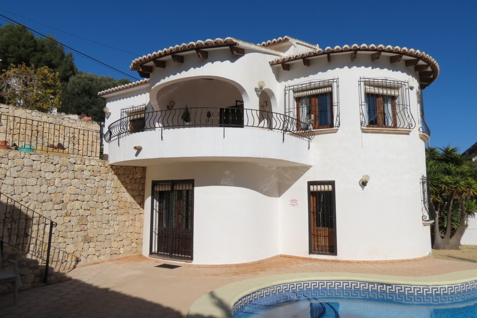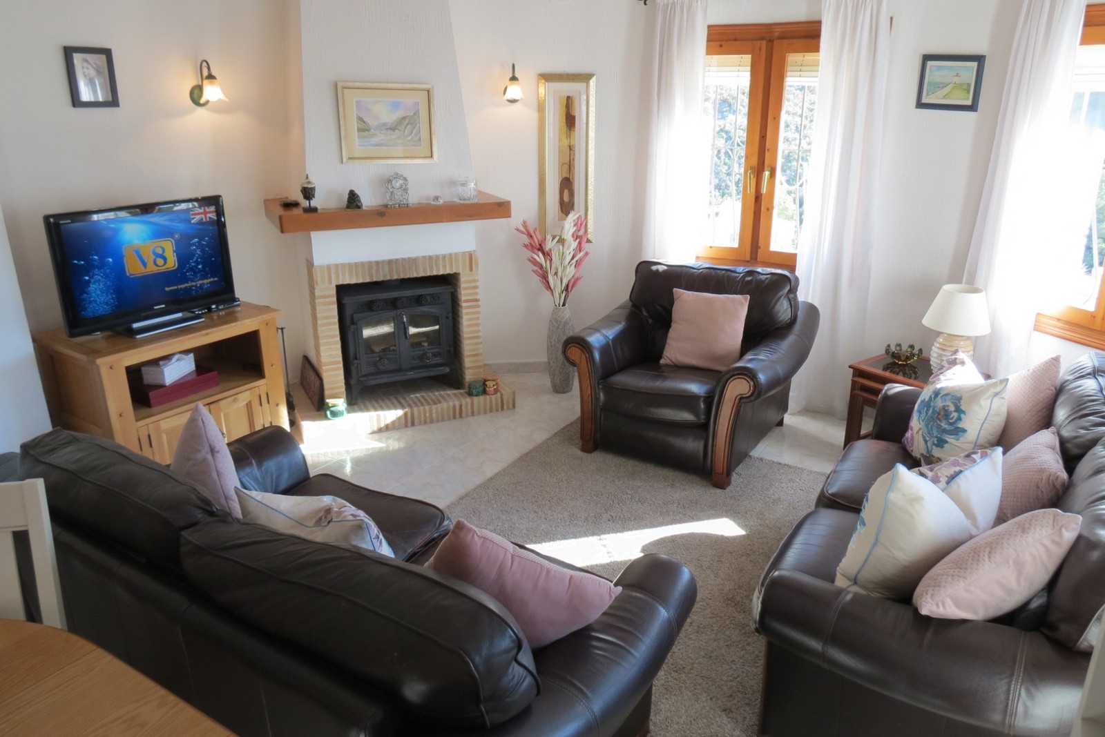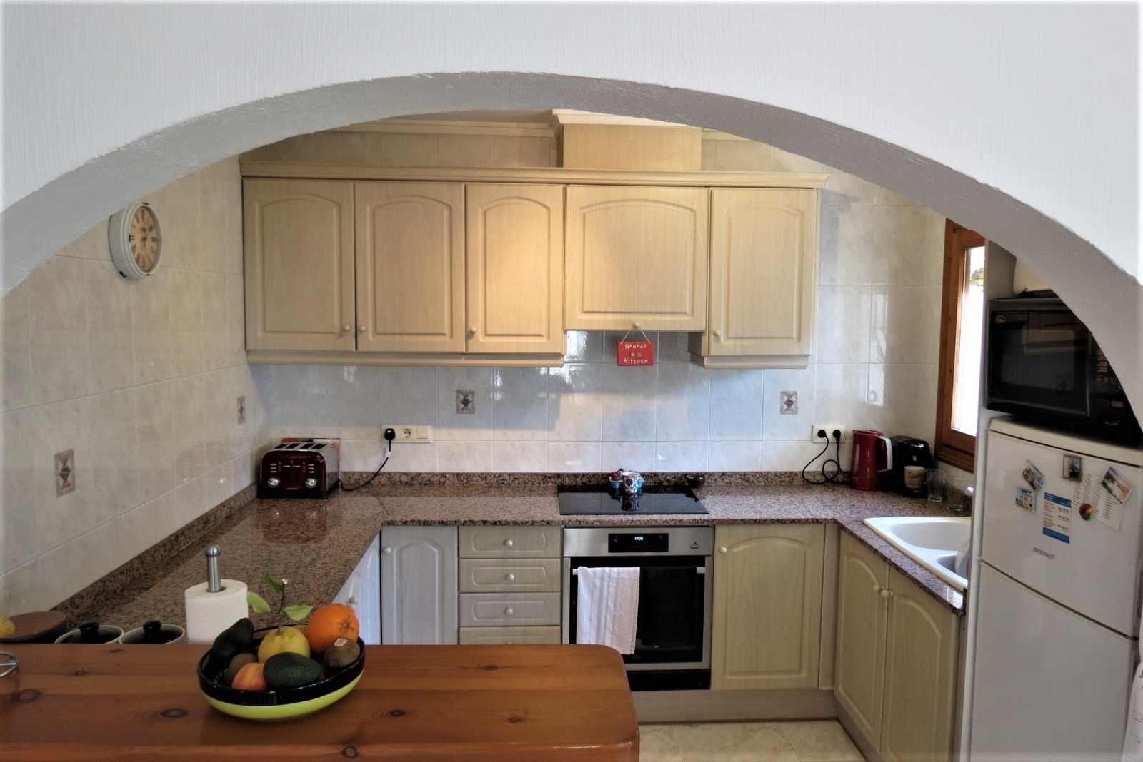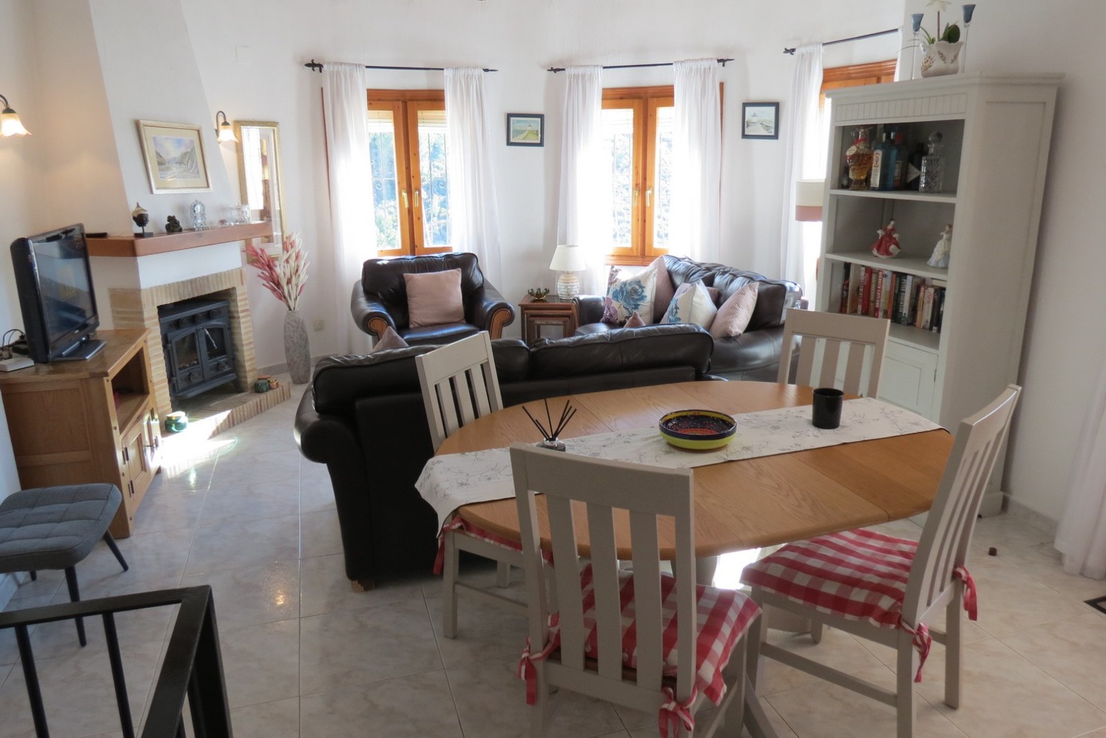 This lovely villa for sale in Valle del Portet, on the outskirts of Moraira, offers beautiful views to the green zone hills and all the way down to the sea at El Portet beach. The property is conveniently located just 1.2km to a shopping centre, 4.1km to El Portet beach and 4.7km to Moraira town centre. At street level the property has a gated parking area for two cars and then a few steps down to the main living level of the villa. You enter the villa through the open naya and then into the open plan living area which consists of a luminous living area with feature fireplace and woodburner, a dining area between the kitchen and the naya and an open kitchen with pale wood effect units and Rosa Porrino granite worktops.To the left of the living area is a spacious double bedroom with built-in wardrobes and the house bathroom which includes a shower. Down the internal staircase you reach a small hallway, to the left is a double bedroom which has a dressing area and an en-suite bathroom with vanity unit and walk-in shower. Further down the hallway to the left is a bright large bedroom with built-in wardrobes and a glazed door leading out to the pool terrace, opposite there is a bathroom which includes a bath with shower attachment. At the end of the hall is the fourth bedroom which is currently used as a utility room and storage room, this room also has glazed doors leading out to the pool terrace. Externally there is a semicircular terrace and open naya with lovely views outside the main living level, an easy maintenance garden area at the back of the villa, a storage room underneath parking area. There is a large pool terrace with barbecue and alfresco dining area and two steps down there is another large terrace with the pool shower, garden shed and a relaxing area perfect for the last rays of the daily sunshine. At the bottom of the garden there are two terraces with natural stone walls, the pool pump room, fruit trees and a Yucca.