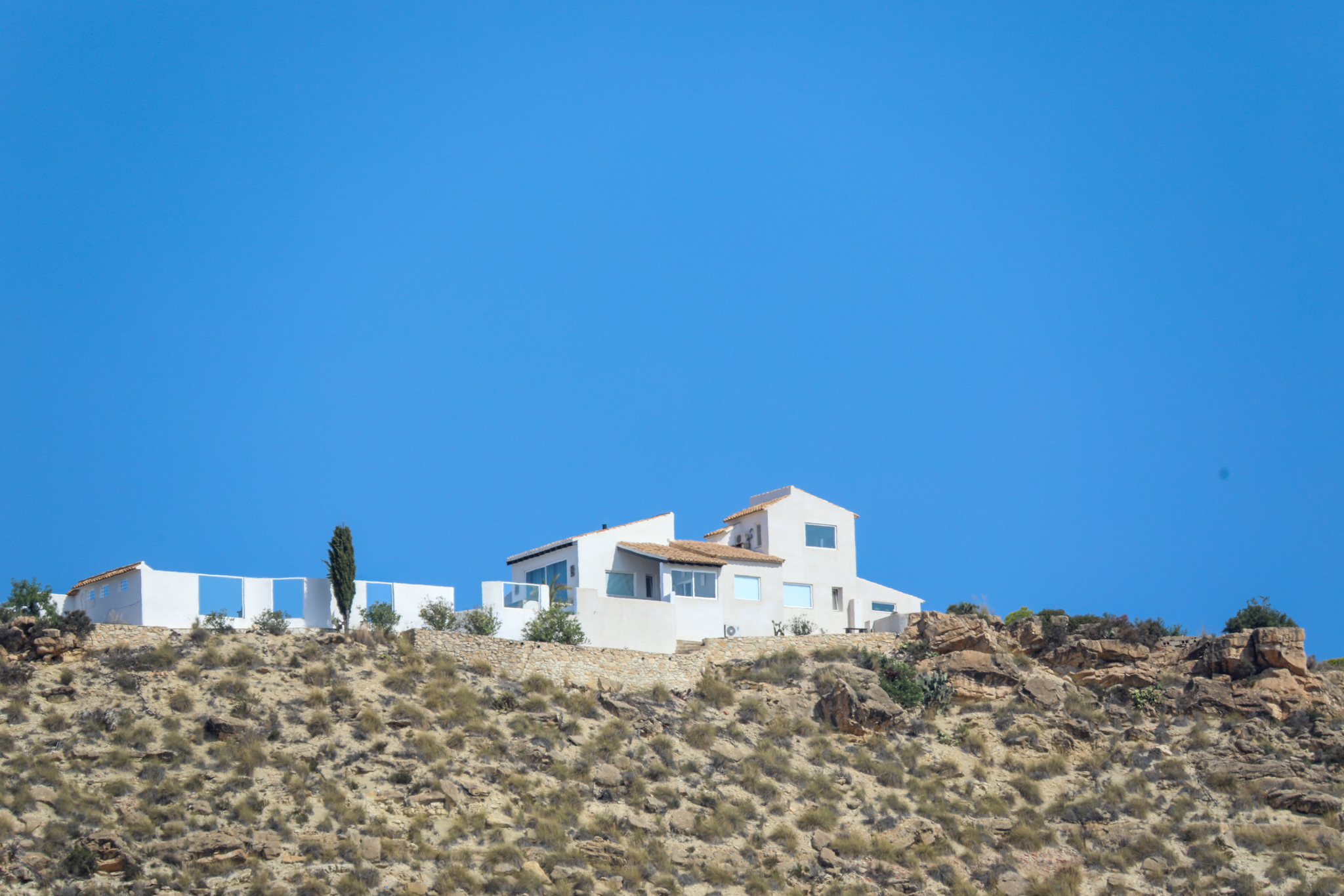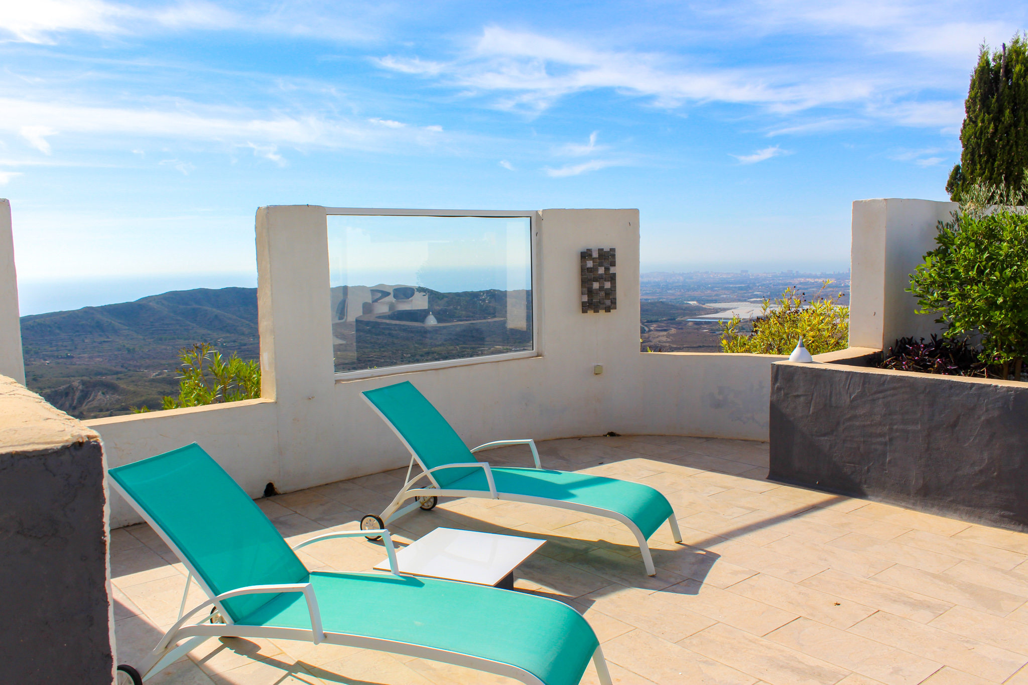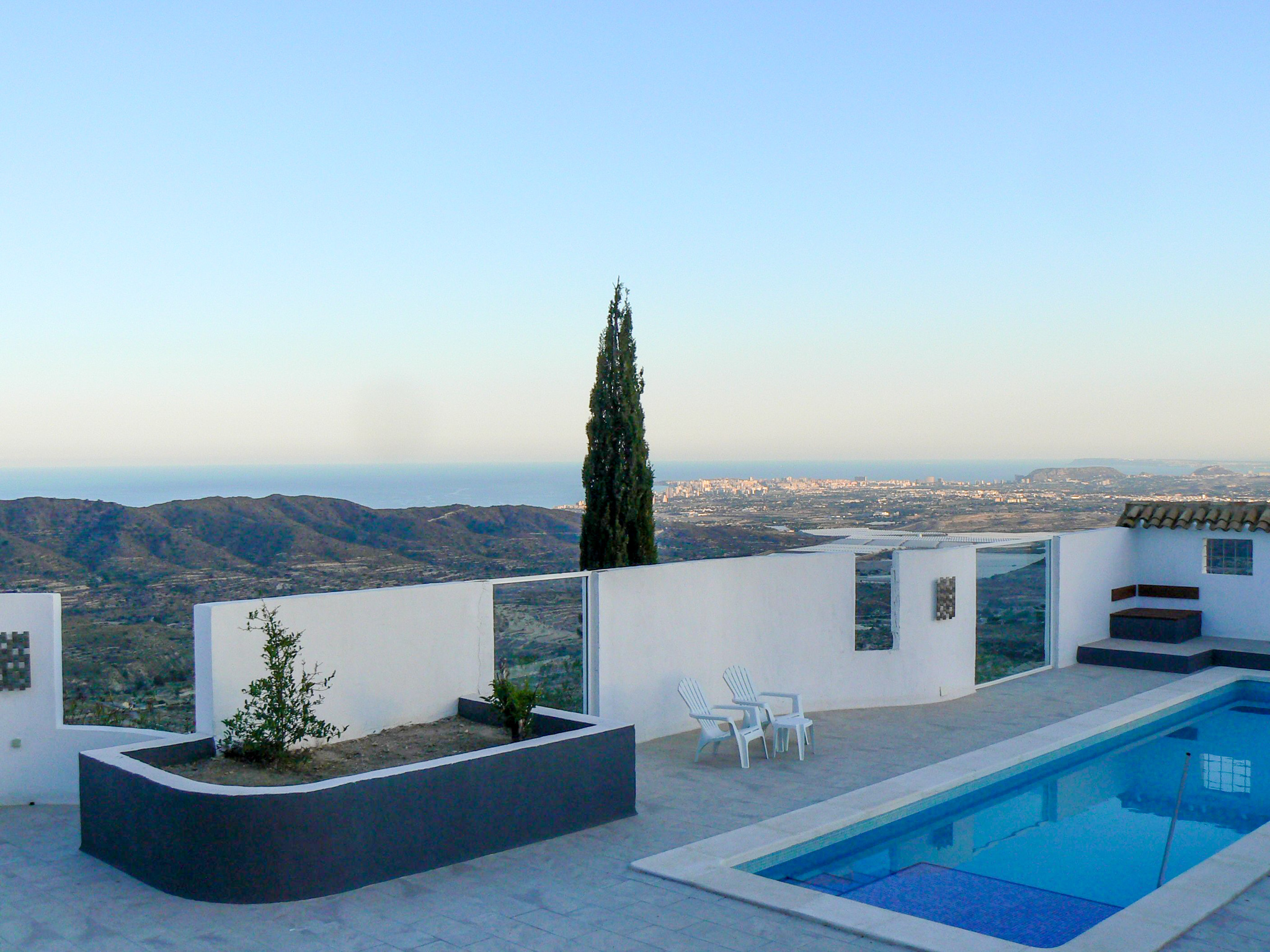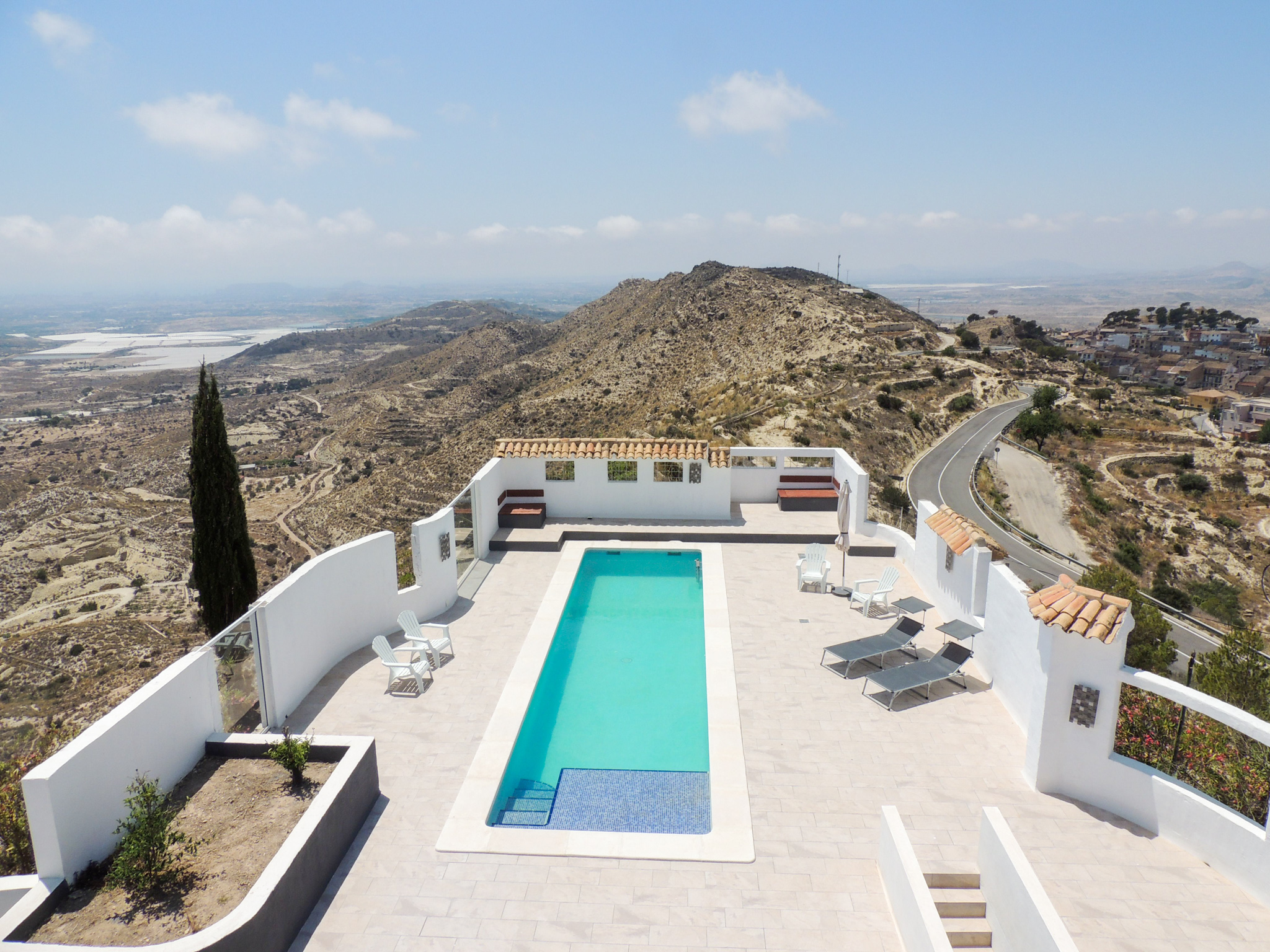 Denne fantastiske villa er med sin beliggenhed helt enestående, da man har ugeneret udsigt i alle retninger – uanset hvor i huset eller på grunden, man befinder sig. Der er smukke landskaber så langt øjet rækker, og man kan se hele vejen til Murcia og Cartagena. Om aftenen er der et spektakulært lys fra Alicante, som lyser hele kyststrækningen op.