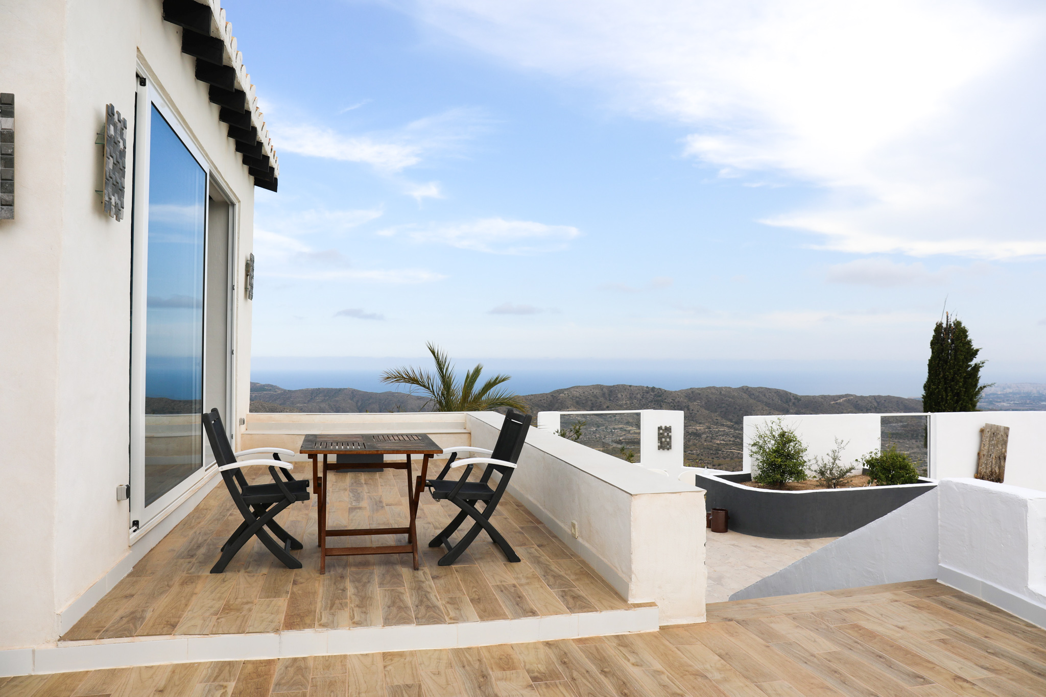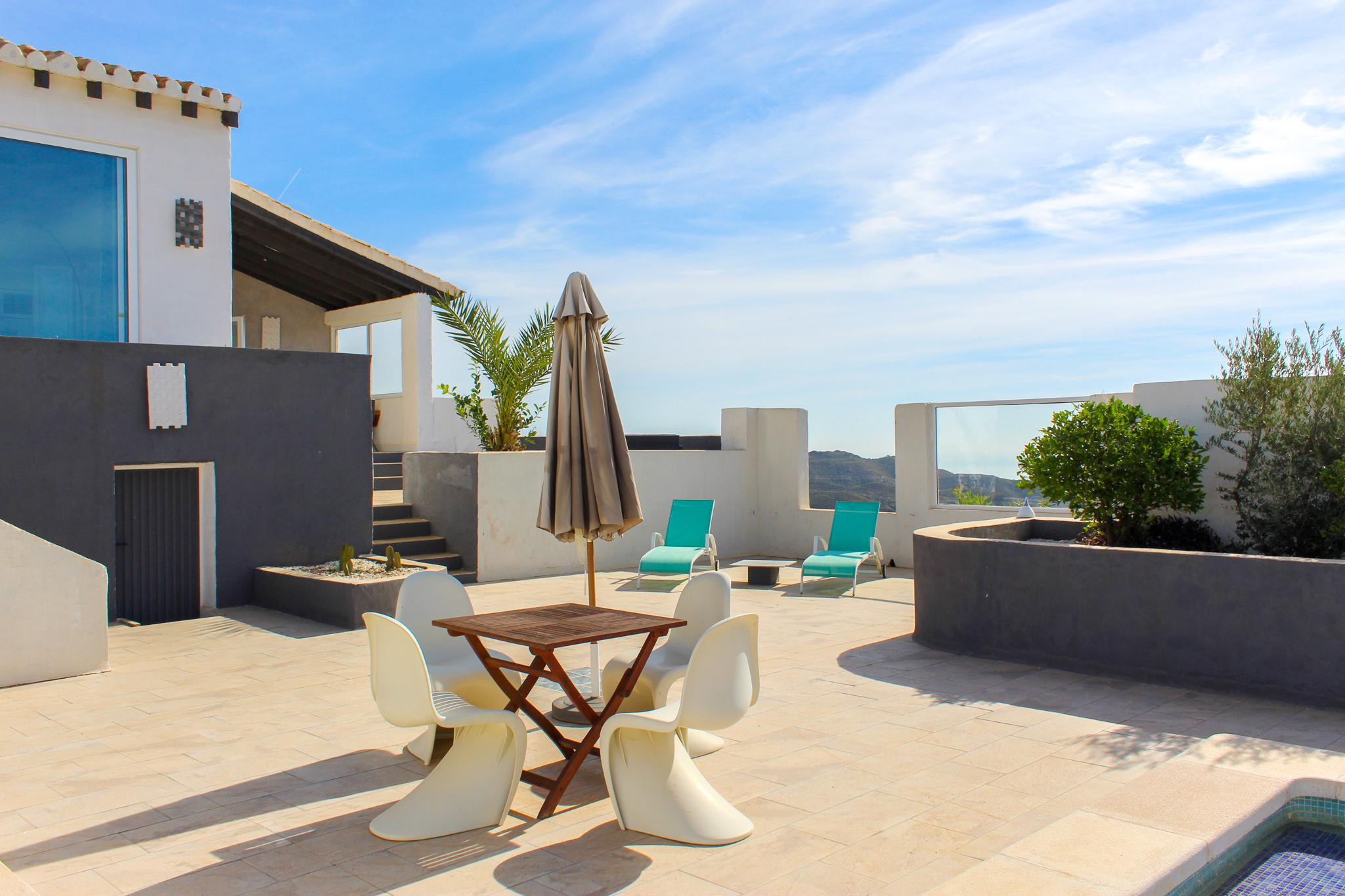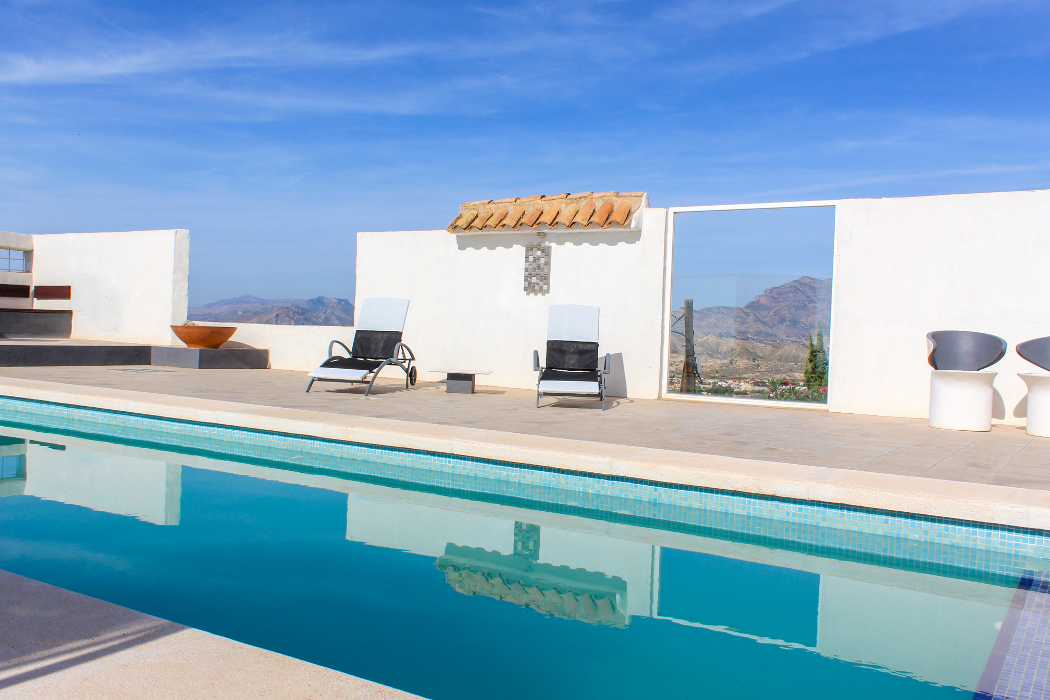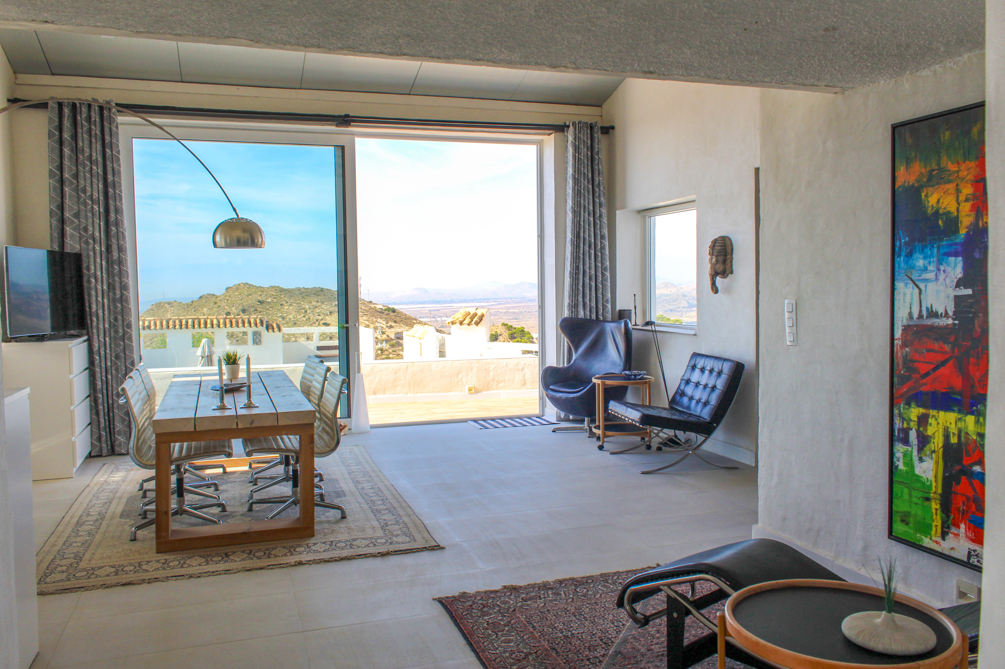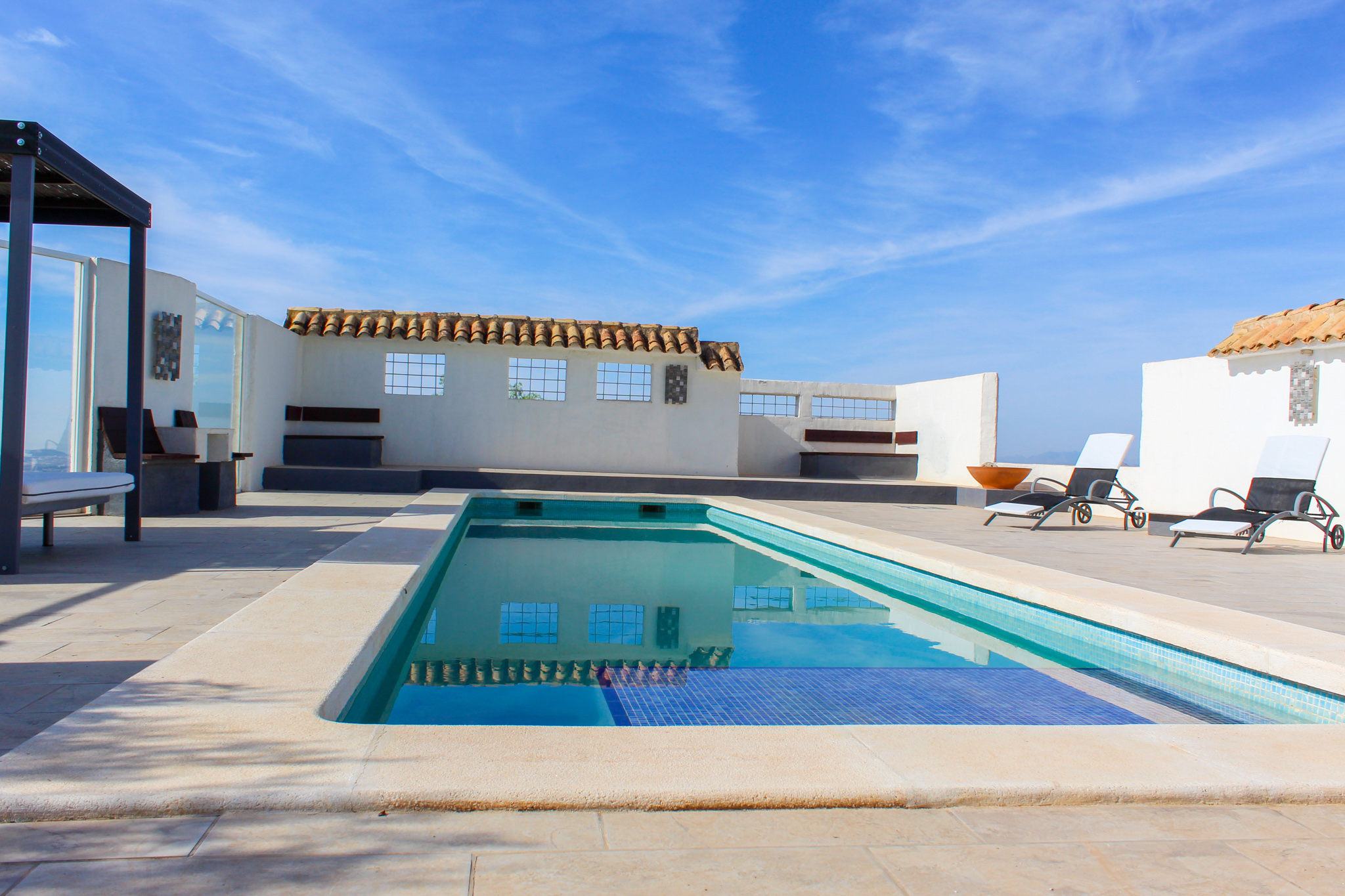 Denne fantastiske villa er med sin beliggenhed helt enestående, da man har ugeneret udsigt i alle retninger – uanset hvor i huset eller på grunden, man befinder sig. Der er smukke landskaber så langt øjet rækker, og man kan se hele vejen til Murcia og Cartagena. Om aftenen er der et spektakulært lys fra Alicante, som lyser hele kyststrækningen op.