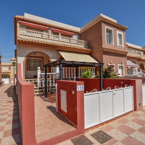 Top Floor south facing completely furnished apartment In Novamar VII with a terrace at the entrance to the apartment and a solarium of 60 m2. It has 2 bedrooms with fitted wardrobes, 2 bathrooms, a living room, an open plan style kitchen with all kitchen appliances and a closed gallery. There is air conditioning ( Hot and Cold ). All the windows have shutters / security grillsThere is a lockable storage room on the solarium. Solarium with some nice views, There is a private parking space in the garage which also has a lockable storage room. The urbanisation is gated and is situated in the lower part of Gran Alacant with a communal pool surrounded by large green areas and .access to Tennis courts. It is near to the bars, restaurants and public transport and the apartment is just 5 mins walking distance from the Carabasí beach