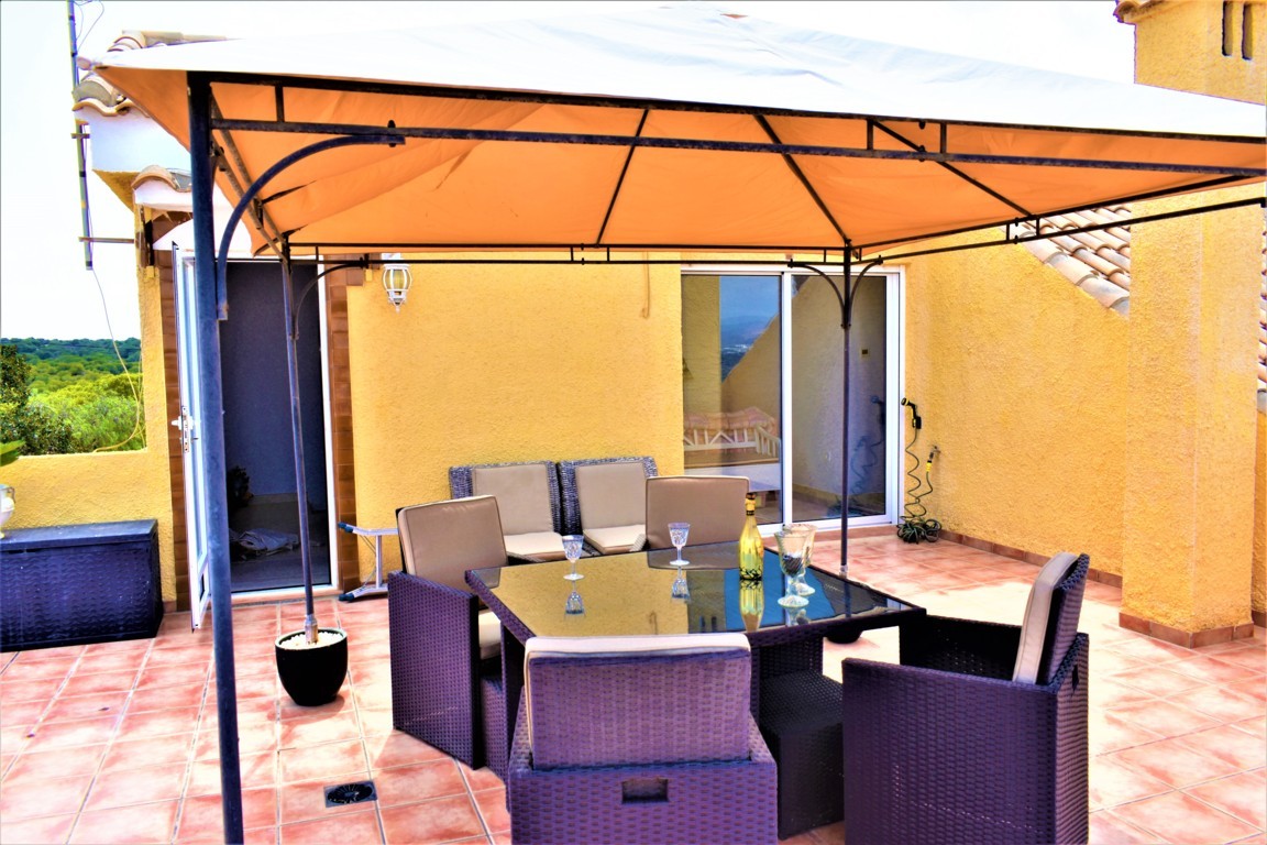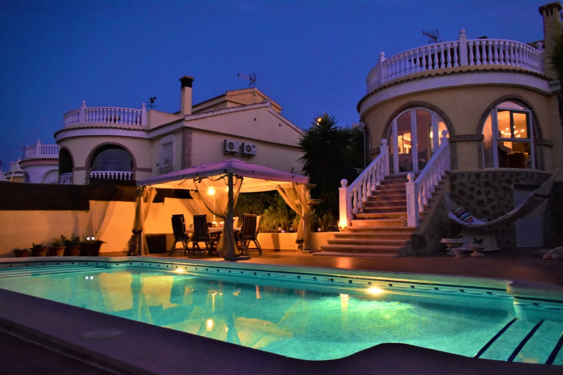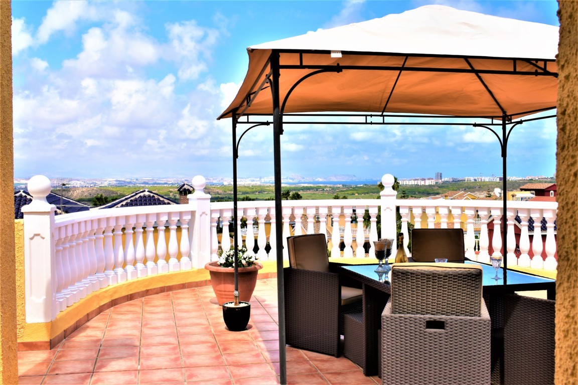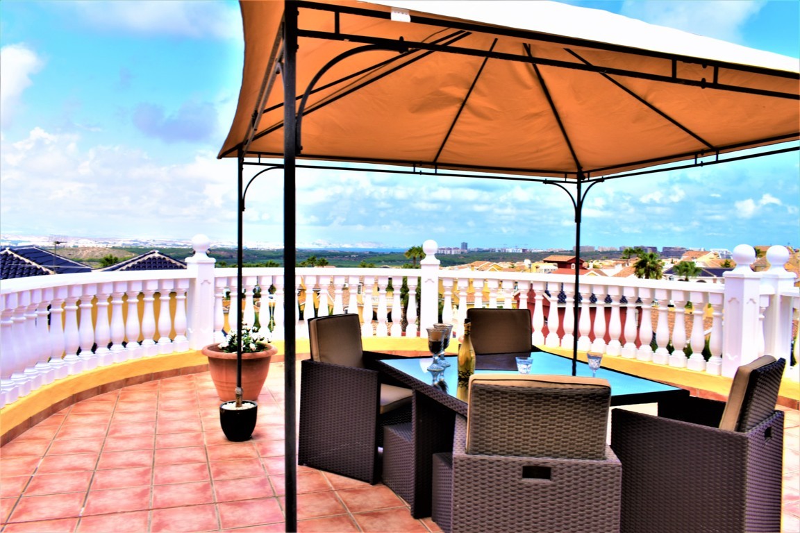 Villaen er i tre etager; lys og venlig kælder, stueplan og første sal samt tagterrasse med pergola, hav- og bjergudsigt og udsigt til Alicante.