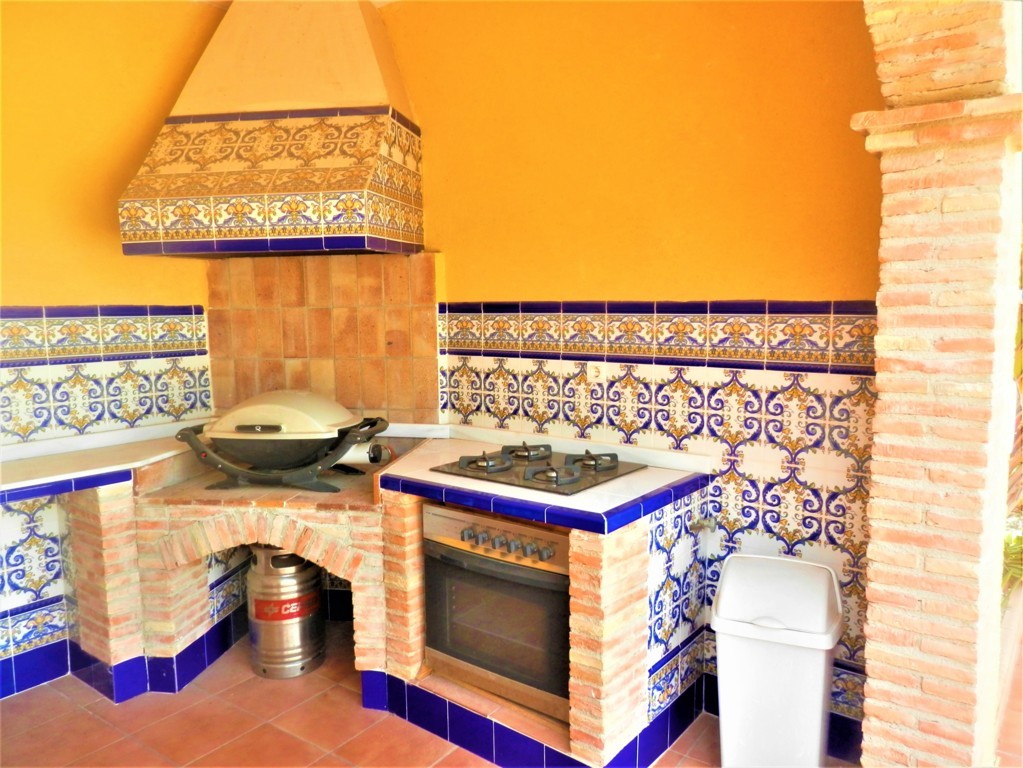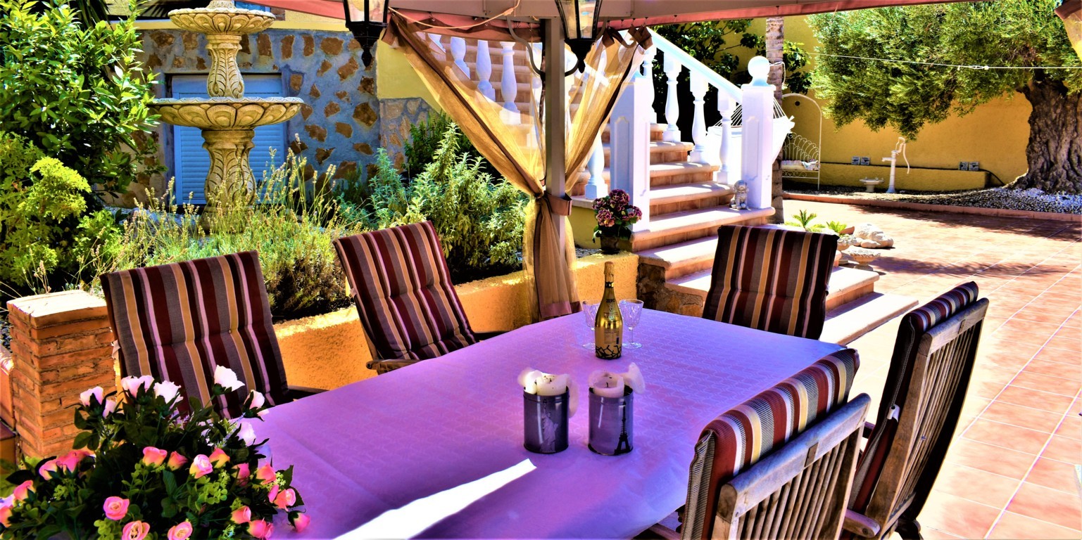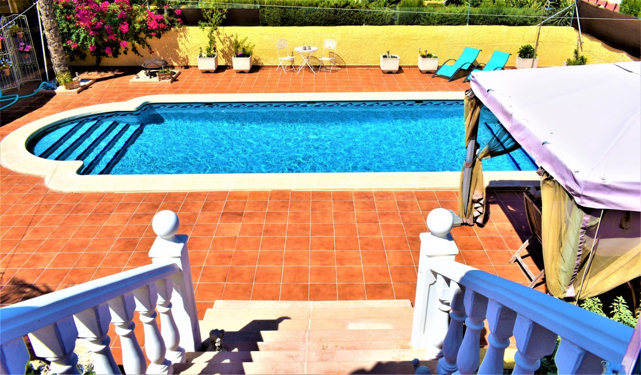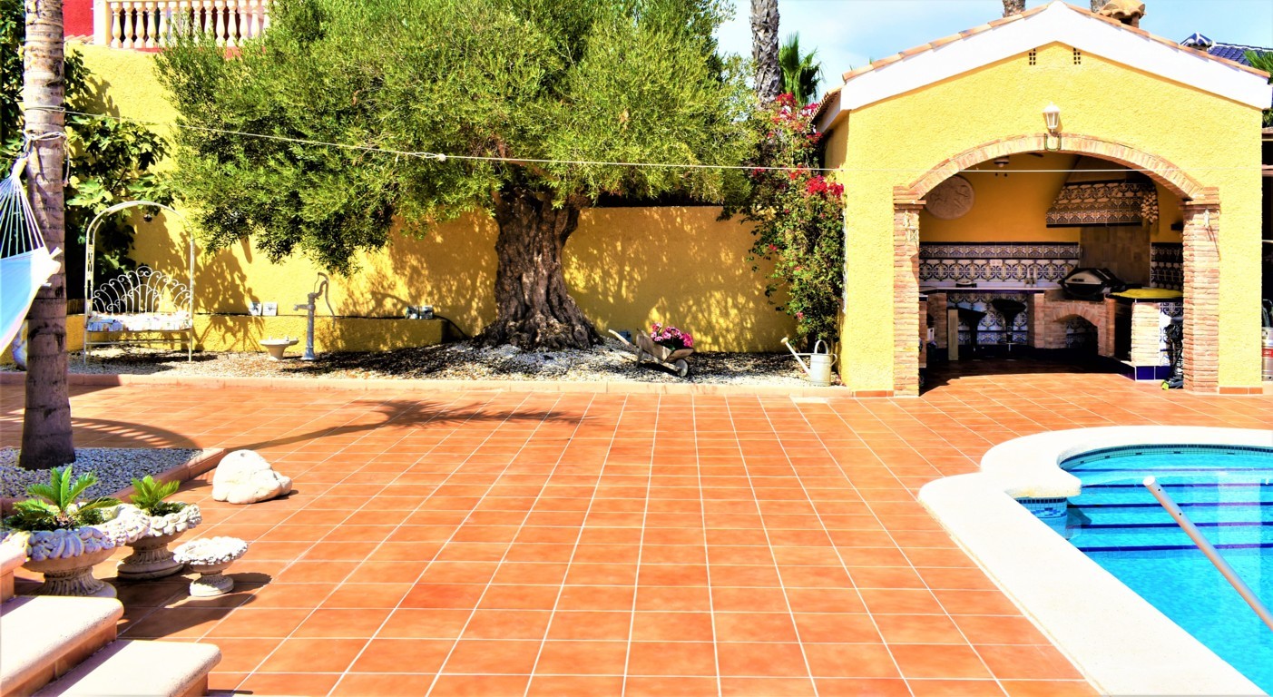 Omkring villaen er der en dejlig have, hvor det meste af arealet er belagt med klinker for at gøre det så vedligeholdelsesfrit som muligt. Havens centrum er en 10 meter lang pool, som er dyb på midten og lav i enderne. I den øvrige have er der masser af palmer, et appelsintræ, citrontræ, figentræ og et 500 år gammelt oliventræ samt en urtehave og automatisk vanding. En ting, der er værd at fremhæve ved villaens terrasseareal, er uden tvivl det store udekøkken, som består af komfur med 4 gasblus og ovn, Weber gasgrill, håndvask og køleskab – alt hvad der er brug for i et køkken. Desuden er der mur rundt om hele grunden, som nogle steder er forhøjet ekstra for mere privatliv.
