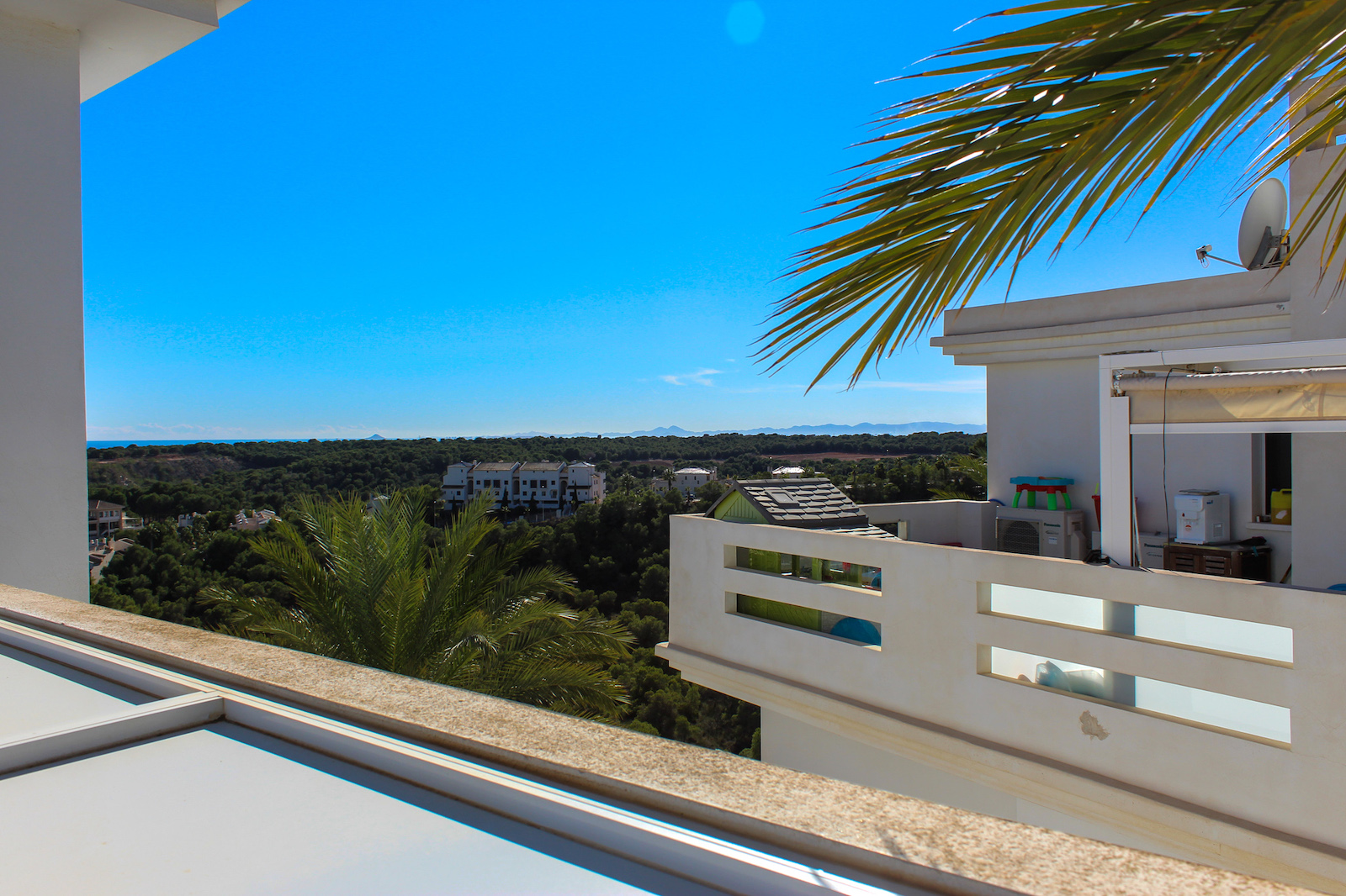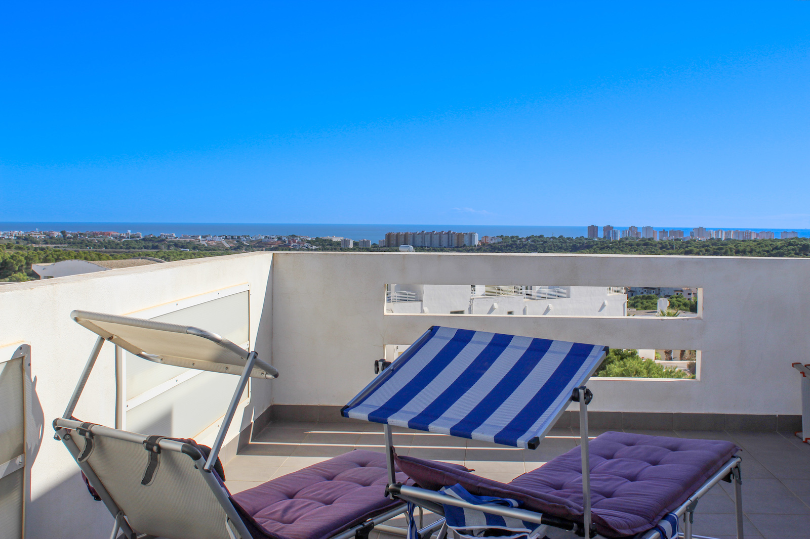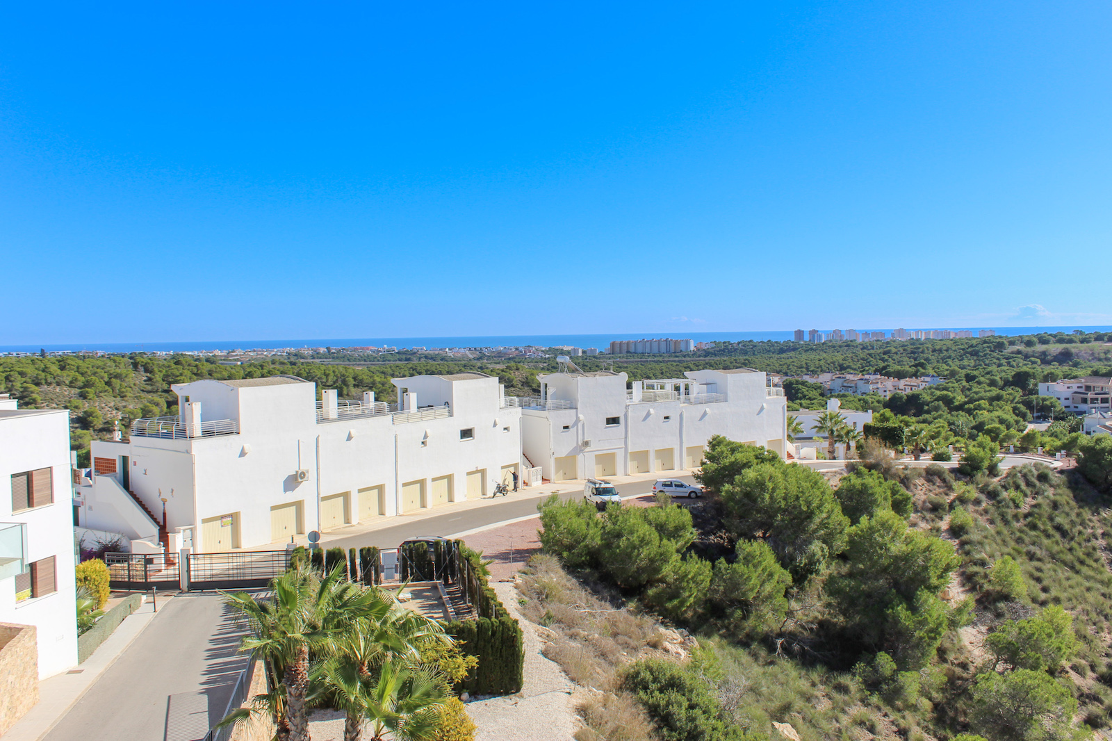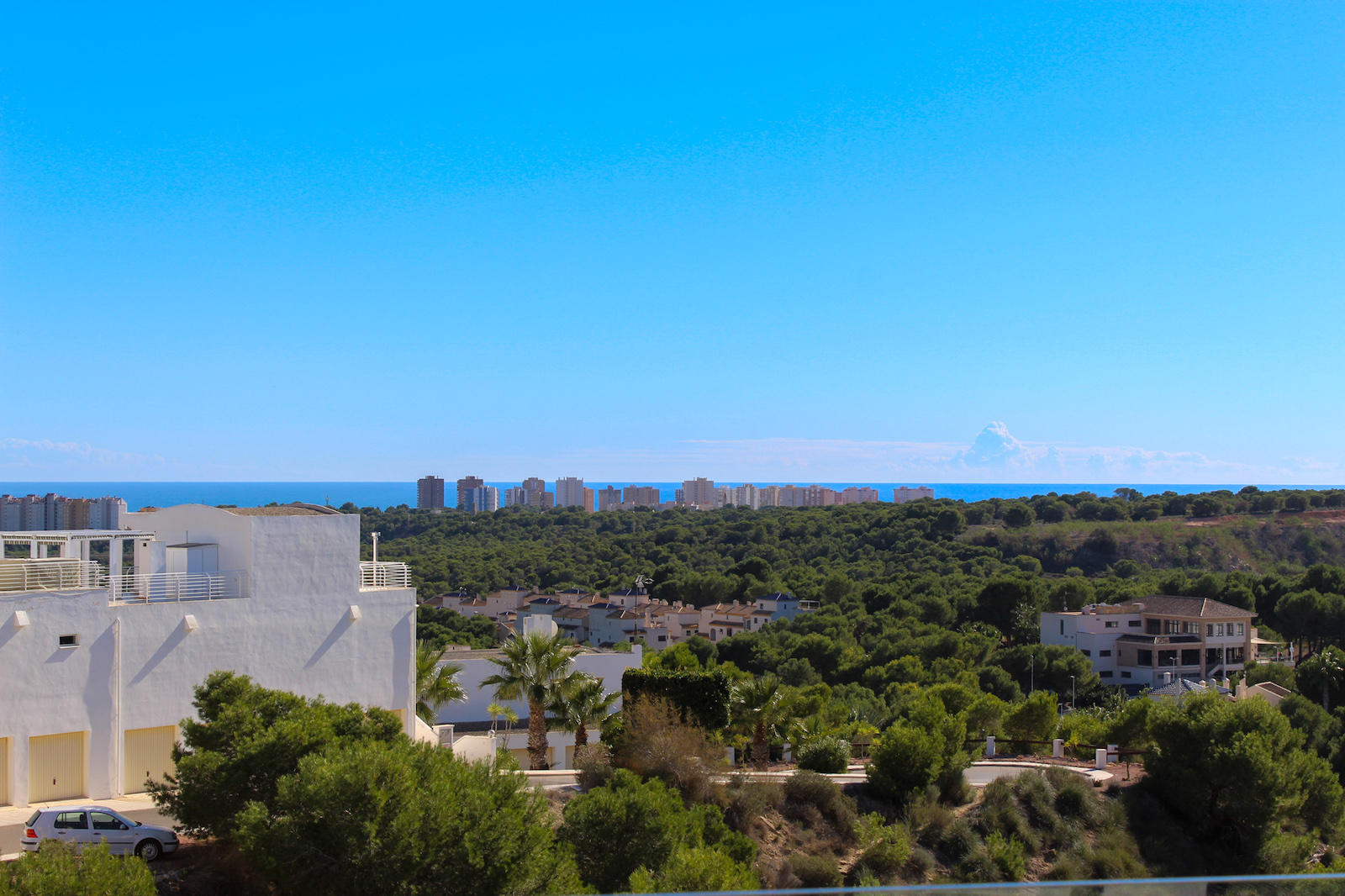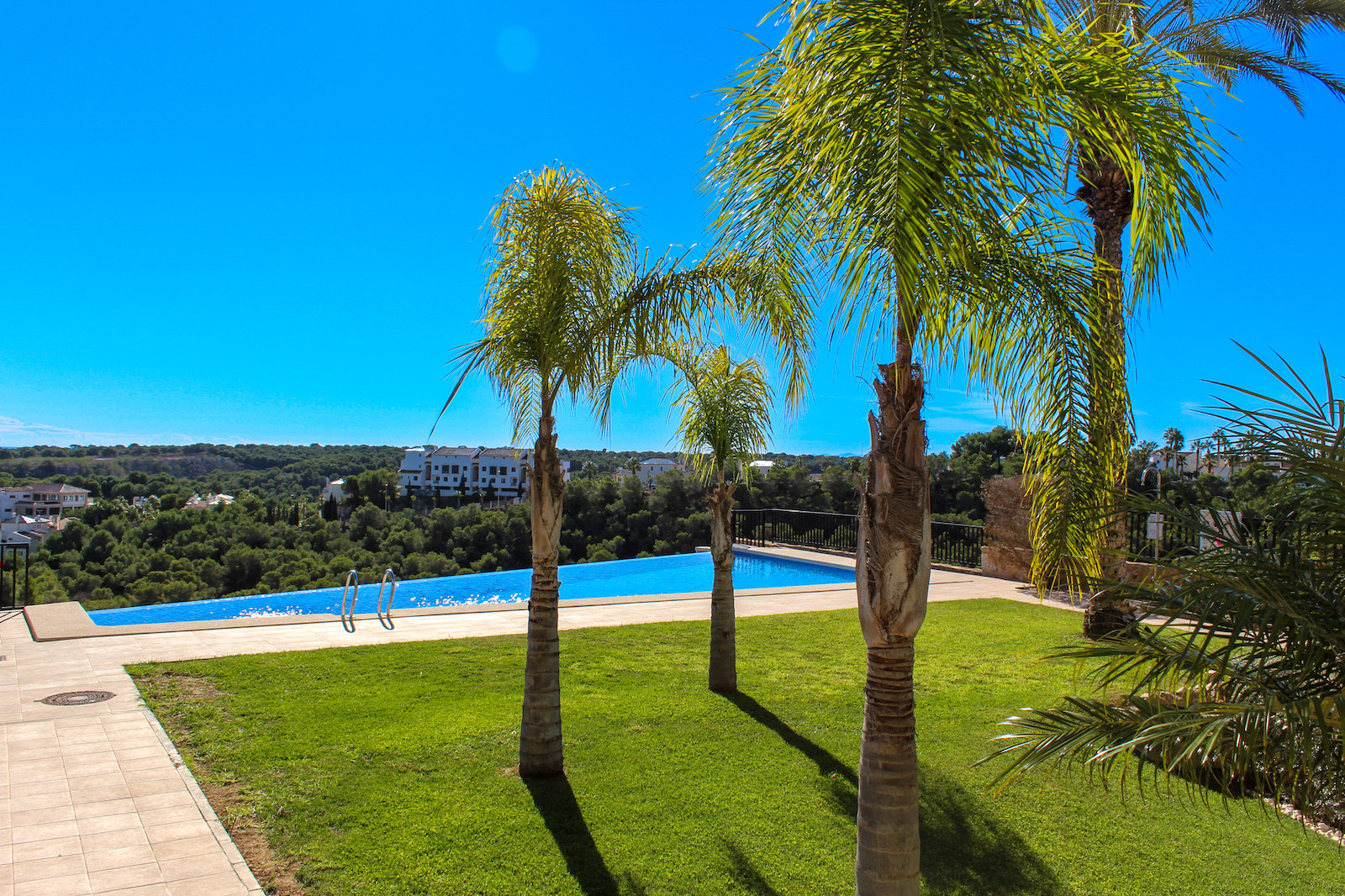 Denne fine og veldistribuerede bungalow-lejlighed med 3 værelser og 2 badeværelser, er beliggende i et decideret smørhul mellem hhv. Villamartín, Campoamor, Las Ramblas og Las Colinas golfbaner. Foruden udsigten over en fredet lund af pinjetræer, samt Las Ramblas golfbane, er der ligeledes en fantastisk, uforstyrret havudsigt; man kan sågar se Middelhavet idet man træder ind i boligen, takket være de store vinduespartier i køkken/alrummet, der går fra gulv til loft.